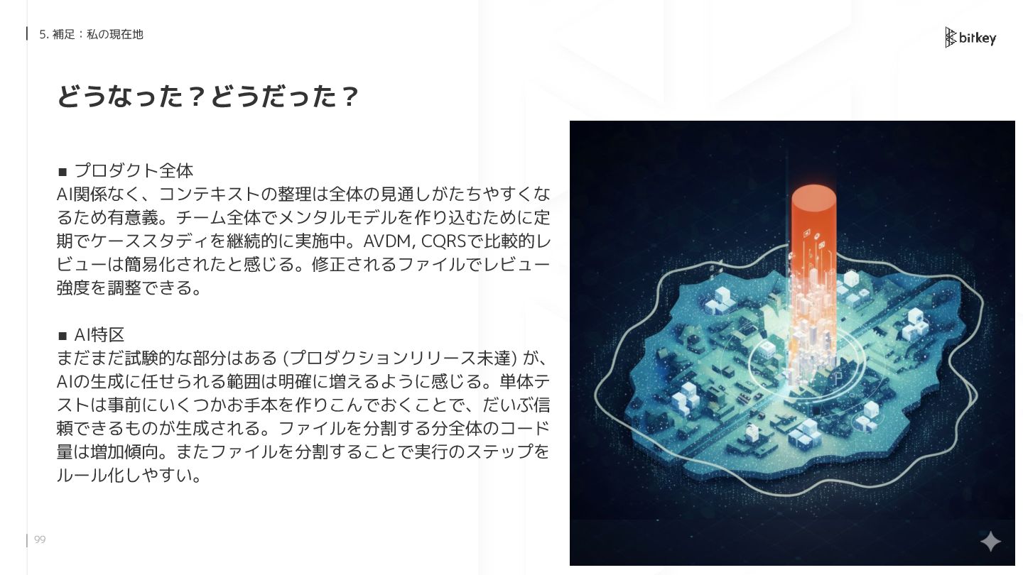 プロダクト全体 AI関係なく、コンテキストの整理は全体の見通しがたちやすくな るため有意義。チーム全体でメンタルモデルを作り込むために定 期でケーススタディを継続的に実施中。AVDM, CQRSで比較的レ ビューは簡易化されたと感じる。修正されるファイルでレビュー 強度を調整できる。 ◼ AI特区 まだまだ試験的な部分はある (プロダクションリリース未達) が、 AIの生成に任せられる範囲は明確に増えるように感じる。単体テ ストは事前にいくつかお手本を作りこんでおくことで、だいぶ信 頼できるものが生成される。ファイルを分割する分全体のコード 量は増加傾向。またファイルを分割することで実行のステップを ルール化しやすい。 5. 補足:私の現在地 どうなった?どうだった?