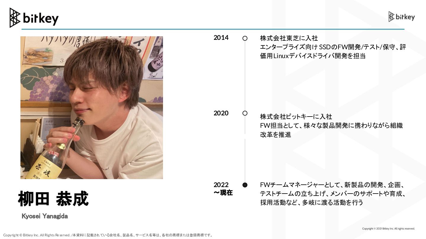 FW開発/テスト/保守、評 価用Linuxデバイスドライバ開発を担当 株式会社ビットキーに入社 FW担当として、様々な製品開発に携わりながら組織 改革を推進 2022 〜現在 FWチームマネージャーとして、新製品 開発、企画、 テストチーム 立ち上げ、メンバー サポートや育成、 採用活動など、多岐に渡る活動を行う Copyright © Bitkey Inc. All Rights Reserved. /本資料に記載されている会社名、製品名、サービス名等 、各社 商標また 登録商標です。