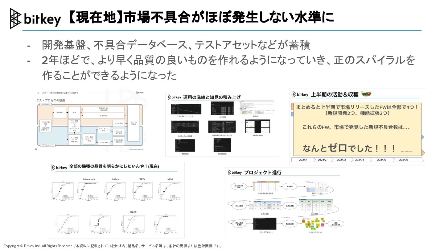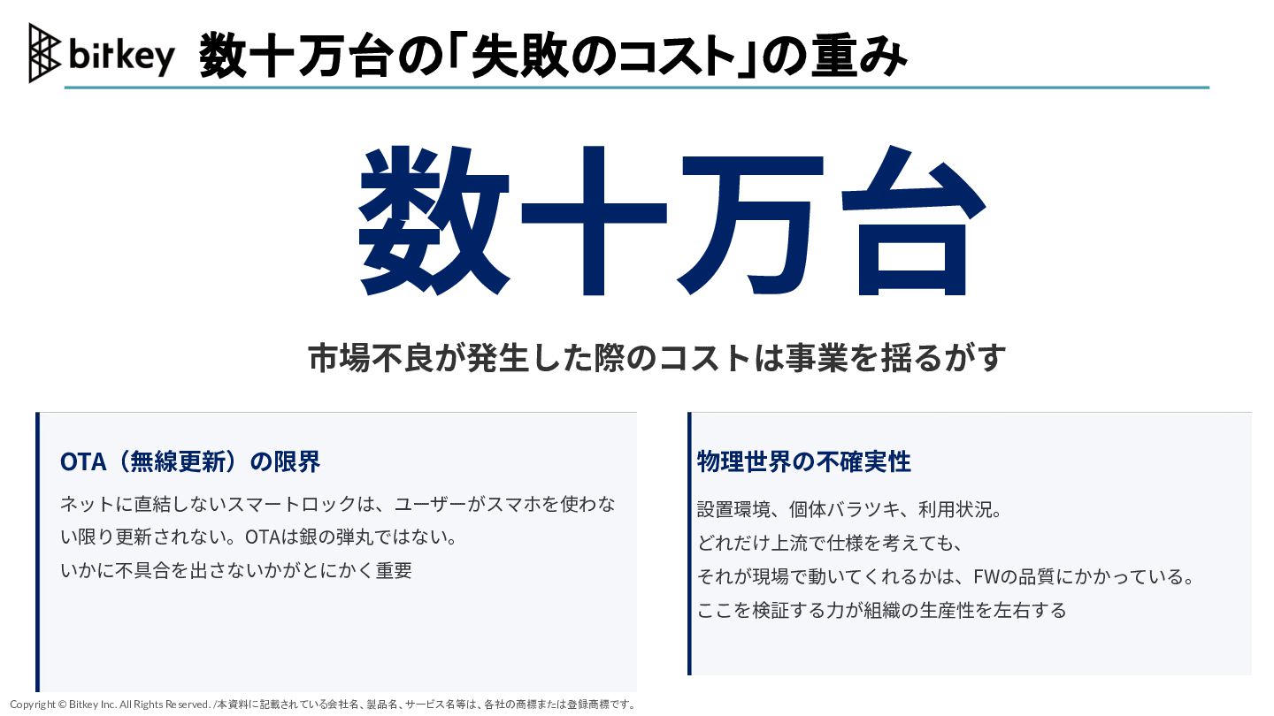 物理世界の不確実性 設置環境、個体バラツキ、利⽤状況。 どれだけ上流で仕様を考えても、 それが現場で動いてくれるかは、FWの品質にかかっている。 ここを検証する⼒が組織の⽣産性を左右する Copyright © Bitkey Inc. All Rights Reserved. /本資料に記載されている会社名、製品名、サービス名等 、各社 商標また 登録商標です。