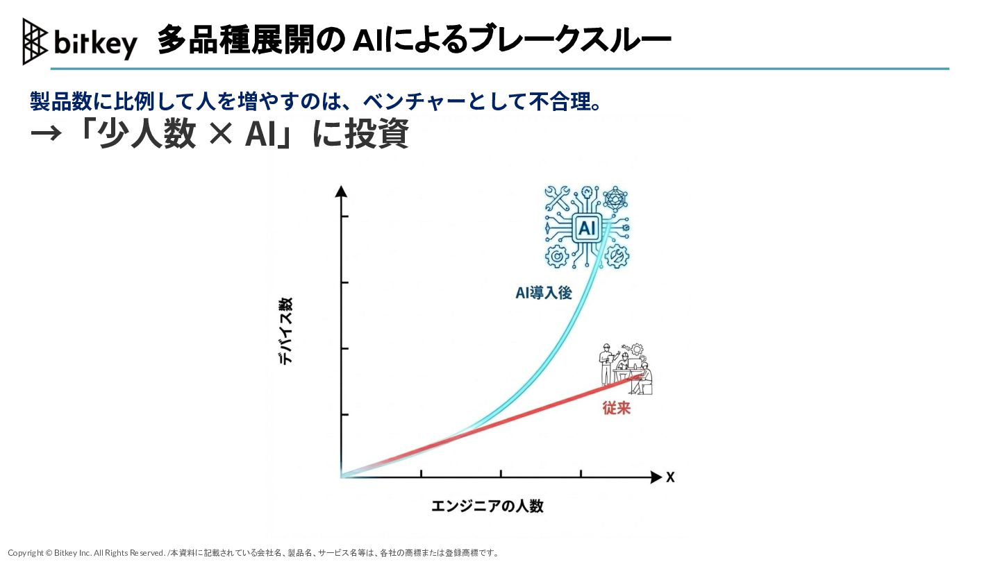 10. 多品種展開 AIによるブレークスルー 製品数に⽐例して⼈を増やすのは、ベンチャーとして不合理。 →「少⼈数 × AI」に投資 Copyright © Bitkey Inc.