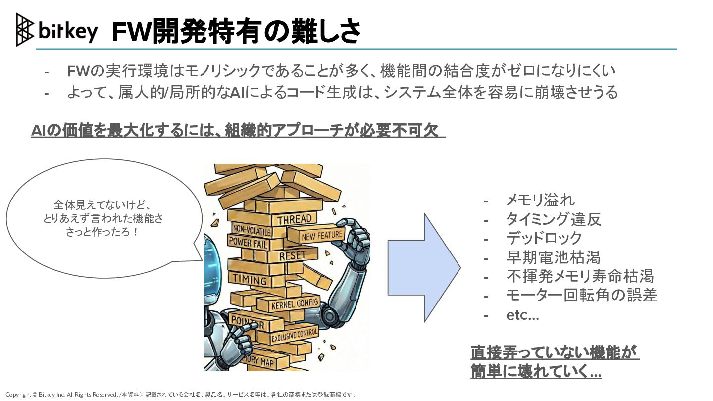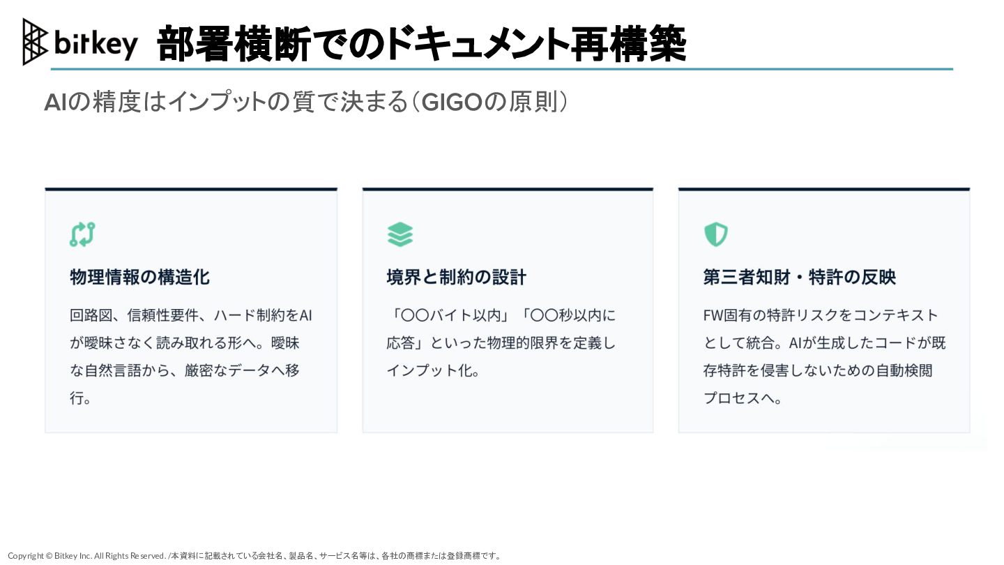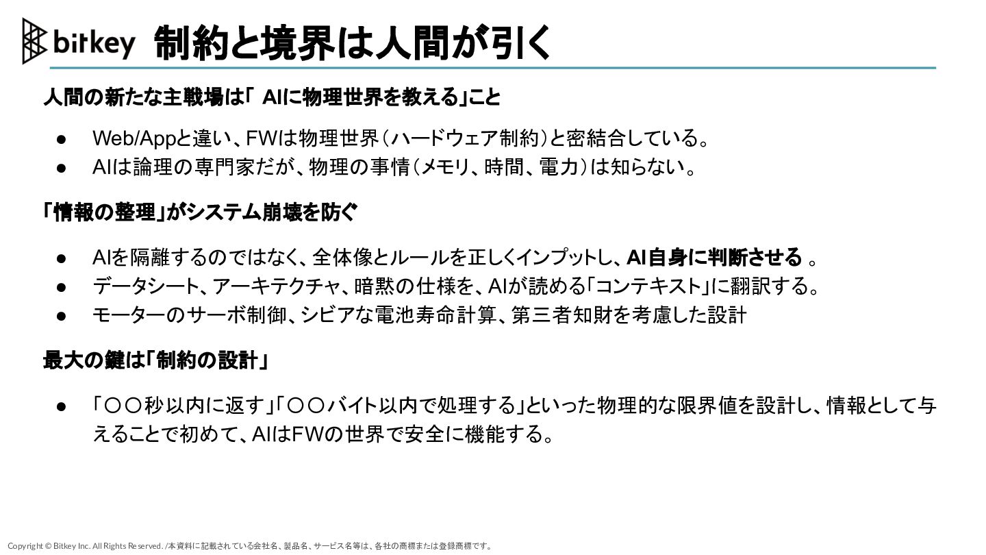 AI 論理 専門家だが、物理 事情(メモリ、時間、電力) 知らない。 「情報 整理」がシステム崩壊を防ぐ • AIを隔離する で なく、全体像とルールを正しくインプットし、AI自身に判断させる 。 • データシート、アーキテクチャ、暗黙 仕様を、AIが読める「コンテキスト」に翻訳する。 • モーター サーボ制御、シビアな電池寿命計算、第三者知財を考慮した設計 最大 鍵 「制約 設計」 • 「〇〇秒以内に返す」「〇〇バイト以内で処理する」といった物理的な限界値を設計し、情報として与 えることで初めて、AI FW 世界で安全に機能する。 Copyright © Bitkey Inc. All Rights Reserved. /本資料に記載されている会社名、製品名、サービス名等 、各社 商標また 登録商標です。