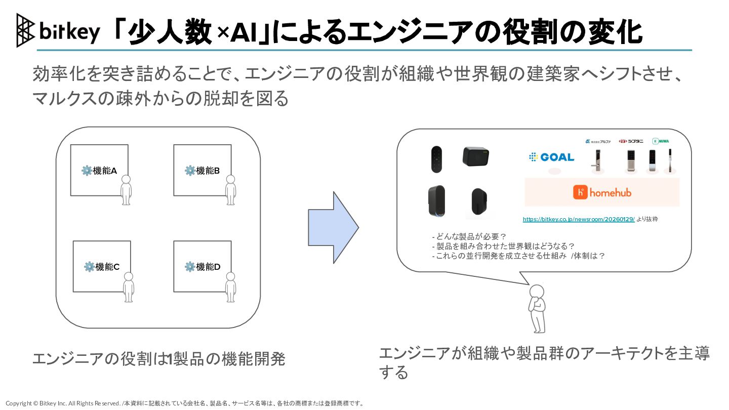 © Bitkey Inc. All Rights Reserved. /本資料に記載されている会社名、製品名、サービス名等 、各社 商標また 登録商標です。 エンジニア 役割 1製品 機能開発 ⚙機能A ⚙機能B ⚙機能C ⚙機能D エンジニアが組織や製品群 アーキテクトを主導 する - どんな製品が必要? - 製品を組み合わせた世界観 どうなる? - これら 並行開発を成立させる仕組み /体制 ? https://bitkey.co.jp/newsroom/20260129/ より抜粋