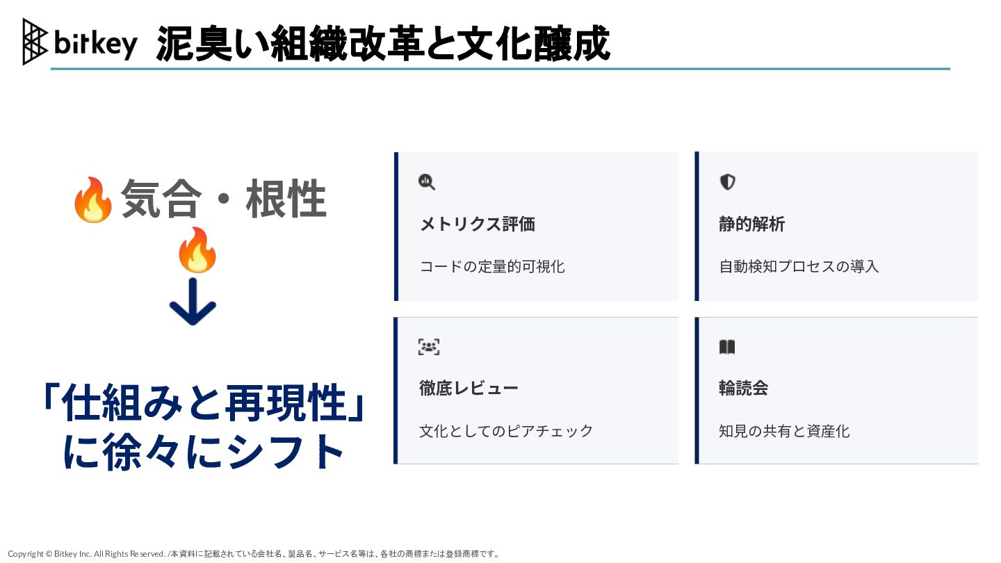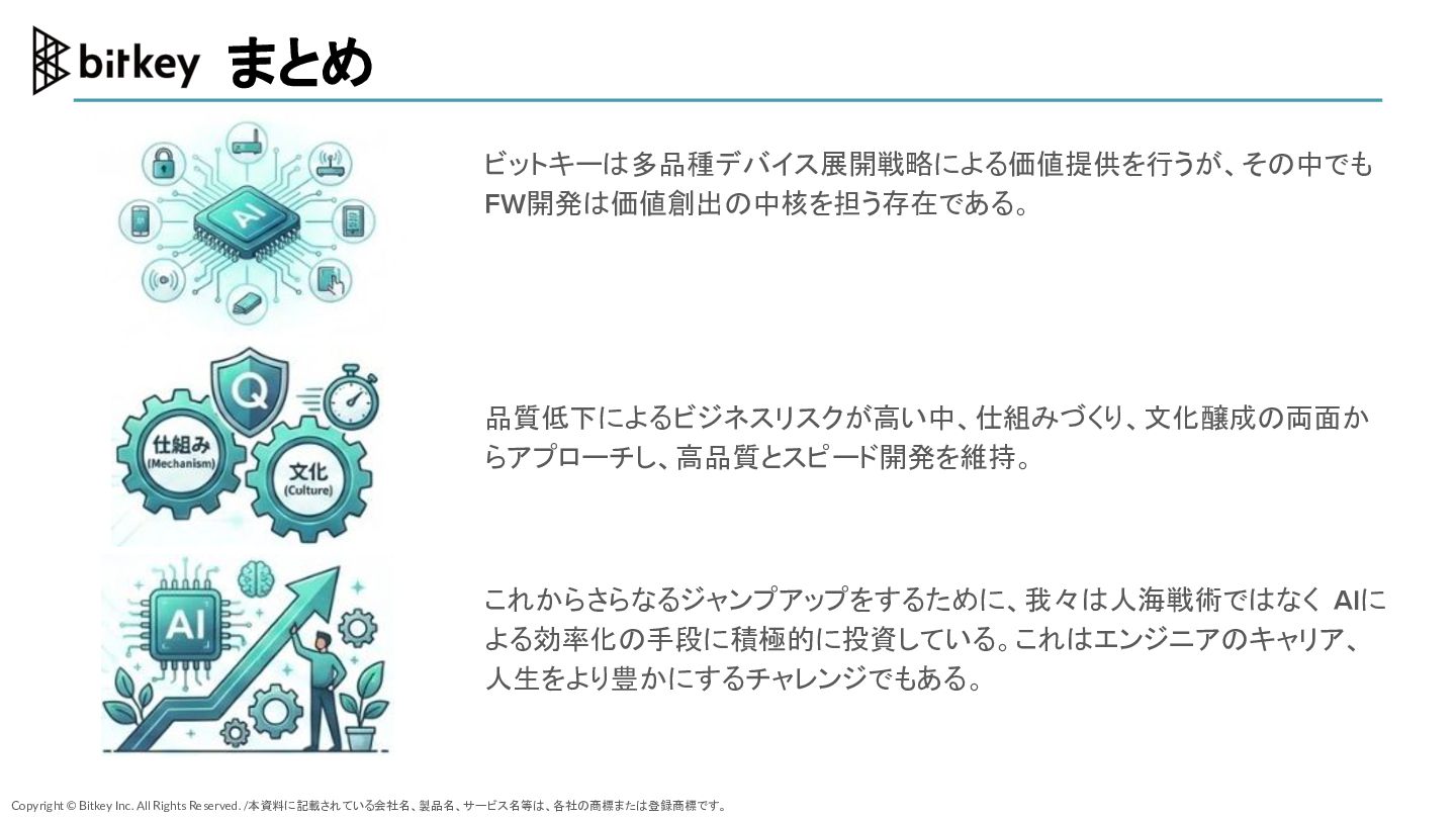 これからさらなるジャンプアップをするために、我々 人海戦術で なく AIに よる効率化 手段に積極的に投資している。これ エンジニア キャリア、 人生をより豊かにするチャレンジでもある。 Copyright © Bitkey Inc. All Rights Reserved. /本資料に記載されている会社名、製品名、サービス名等 、各社 商標また 登録商標です。
