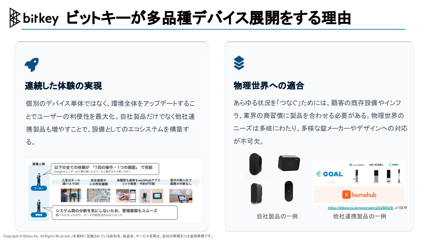る。 物理世界へ 適合 あらゆる状況を「つなぐ」ために 、顧客 既存設備やインフ ラ、業界 商習慣に製品を合わせる必要がある。物理世界 ニーズ 多岐にわたり、多様な錠メーカーやデザインへ 対応 が不可欠。 https://bitkey.co.jp/newsroom/20260129/ より抜粋 他社連携製品 一例 自社製品 一例 Copyright © Bitkey Inc. All Rights Reserved. /本資料に記載されている会社名、製品名、サービス名等 、各社 商標また 登録商標です。