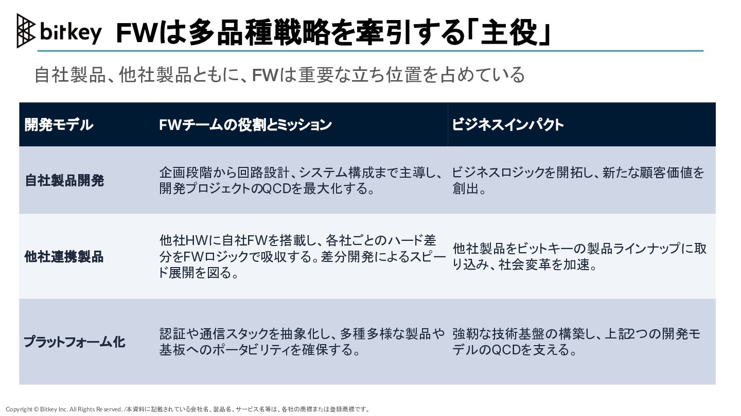 開発プロジェクト QCDを最大化する。 ビジネスロジックを開拓し、新たな顧客価値を 創出。 他社連携製品 他社HWに自社FWを搭載し、各社ごと ハード差 分をFWロジックで吸収する。差分開発によるスピー ド展開を図る。 他社製品をビットキー 製品ラインナップに取 り込み、社会変革を加 。 プラットフォーム化 認証や通信スタックを抽象化し、多種多様な製品や 基板へ ポータビリティを確保する。 強靭な技術基盤 構築し、上記 2つ 開発モ デル QCDを支える。 Copyright © Bitkey Inc. All Rights Reserved. /本資料に記載されている会社名、製品名、サービス名等 、各社 商標また 登録商標です。