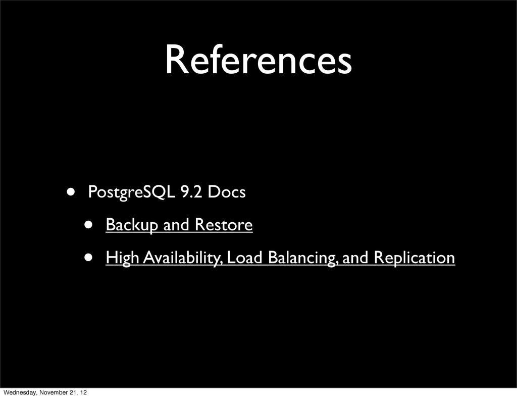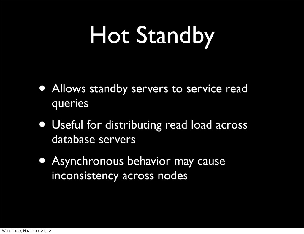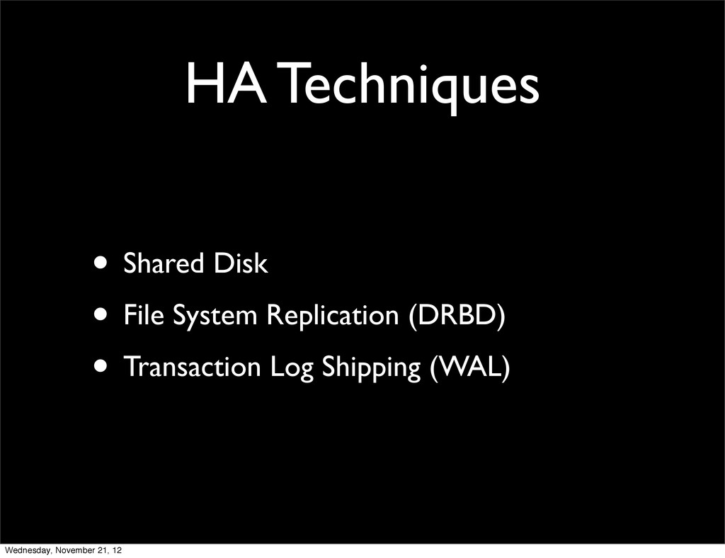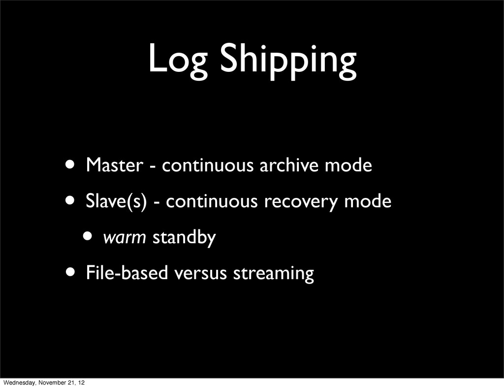 • Transaction Log Shipping (WAL) Wednesday, November 21, 12