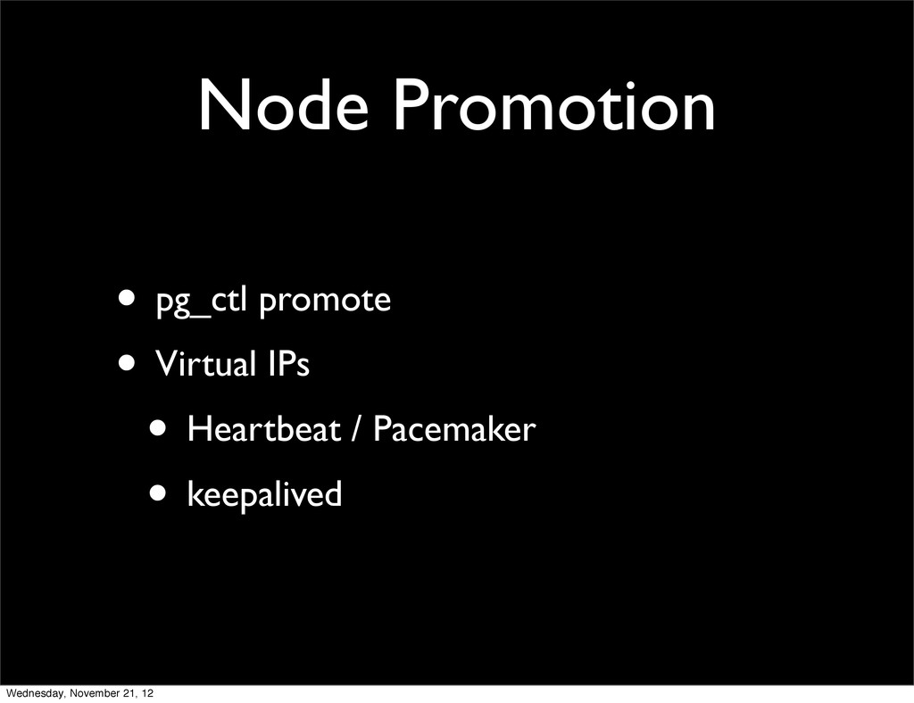 Node Promotion • pg_ctl promote • Virtual IPs • Heartbeat