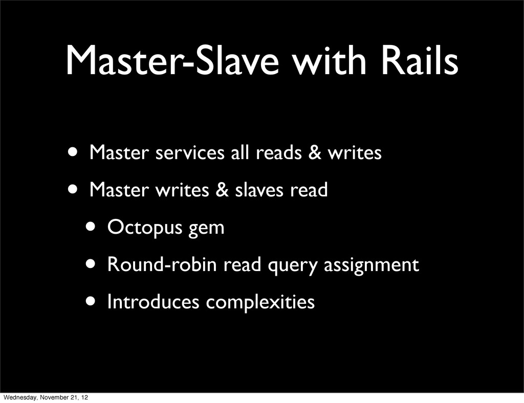 • Master writes & slaves read • Octopus gem • Round-robin read query assignment • Introduces complexities Wednesday, November 21, 12