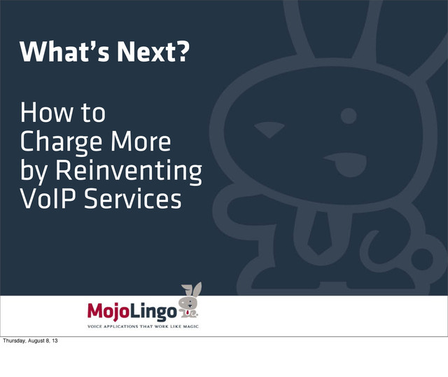 This presentation is all about solving that problem: how to create differentiated real-time communication services that allow you to charge your customers for the value you create, rather than for the minutes they use.