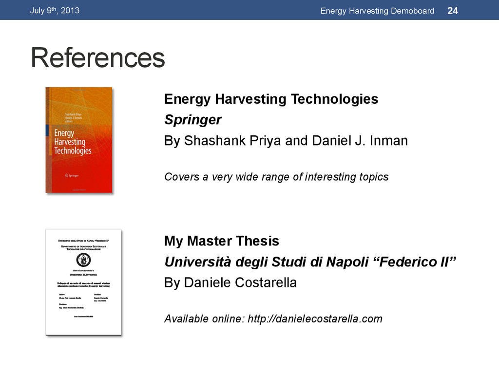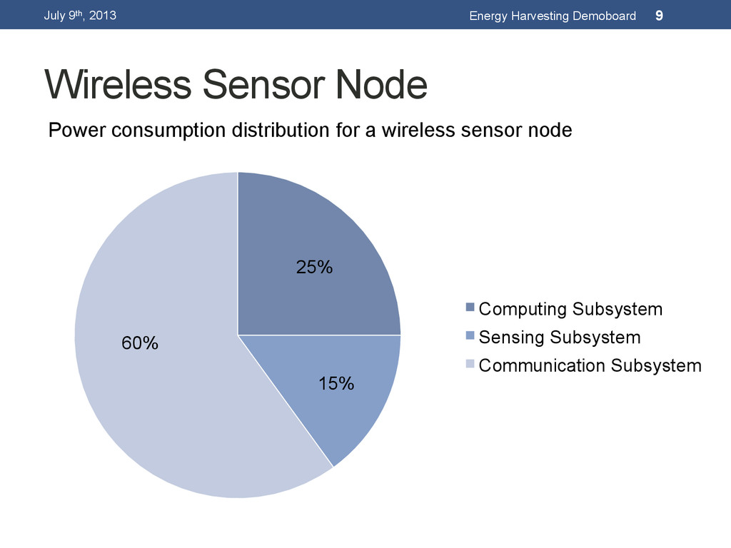 Project and development of a smart Wireless Sensor Network node powered by ambient Energy Harvesting. The demoboard is capable of accepting piezoelectric, solar and thermal-powered energy sources simultaneously. The project comes with a web based real-time data view.