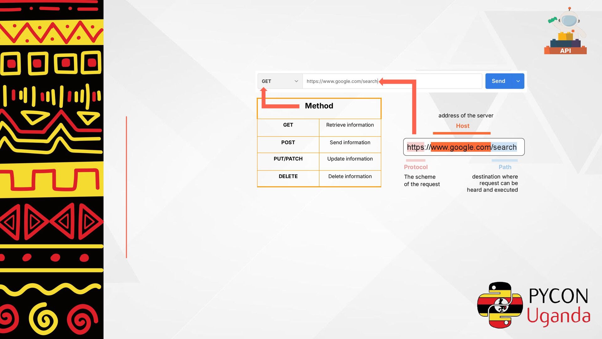 DELETE Delete information address of the server https://www.google.com/search The scheme of the request Host Path Protocol destination where request can be heard and executed