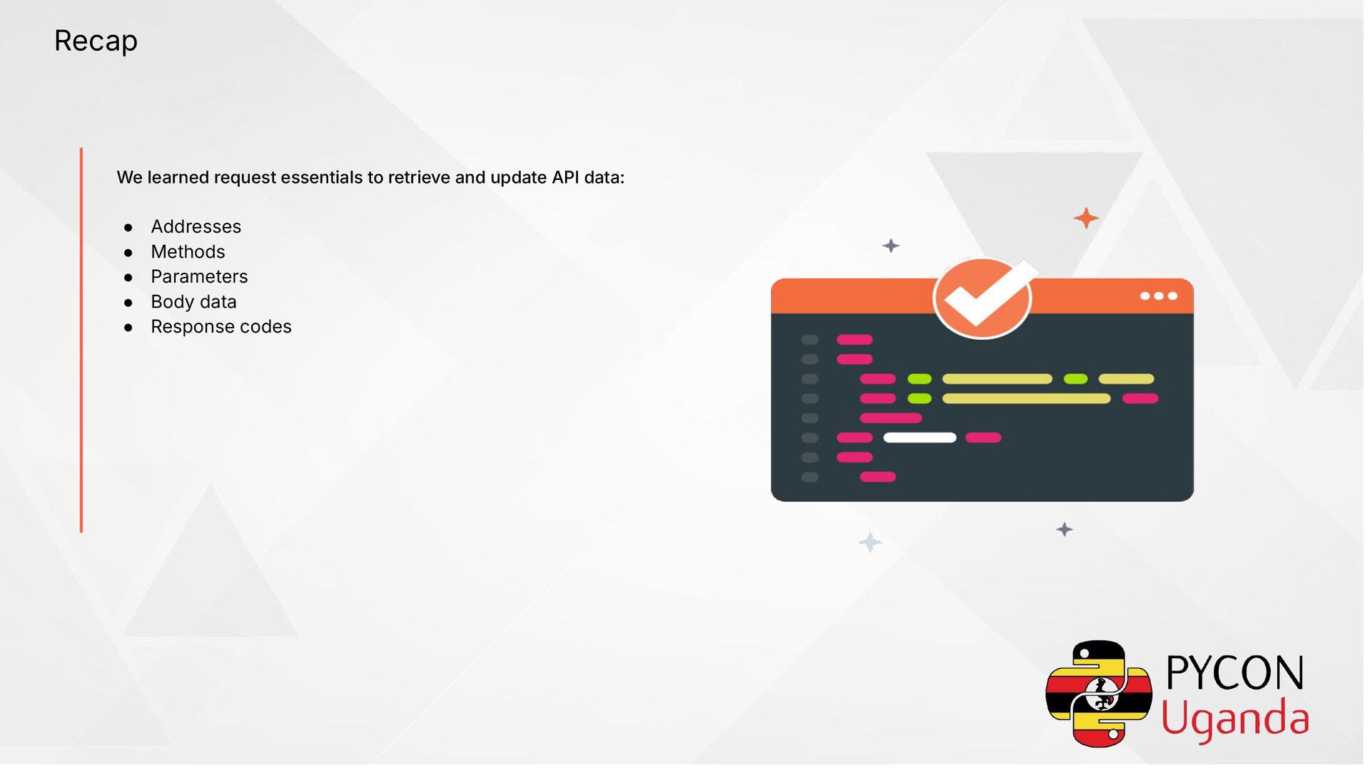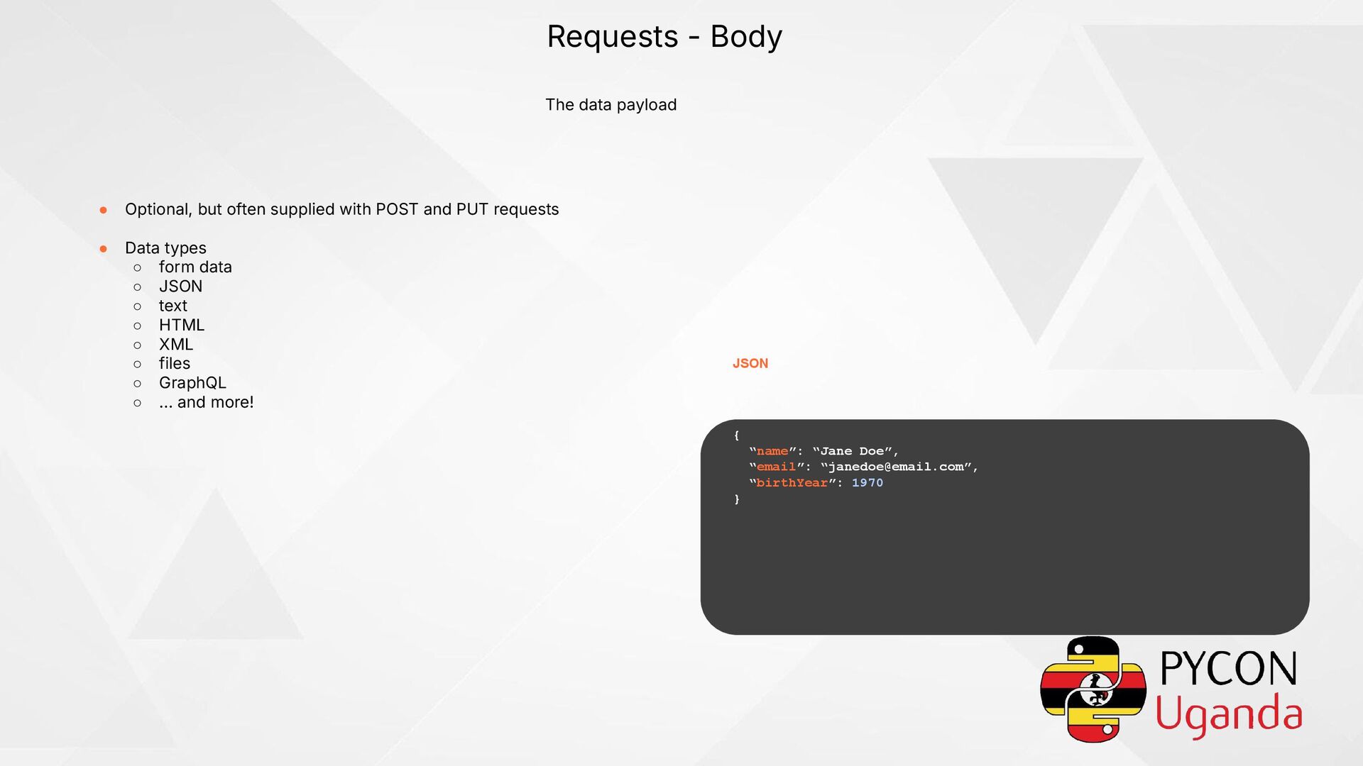 supplied with POST and PUT requests • Data types ◦ form data ◦ JSON ◦ text ◦ HTML ◦ XML ◦ files ◦ GraphQL ◦ … and more! { “name”: “Jane Doe”, “email”: “[email protected]”, “birthYear”: 1970 } JSON