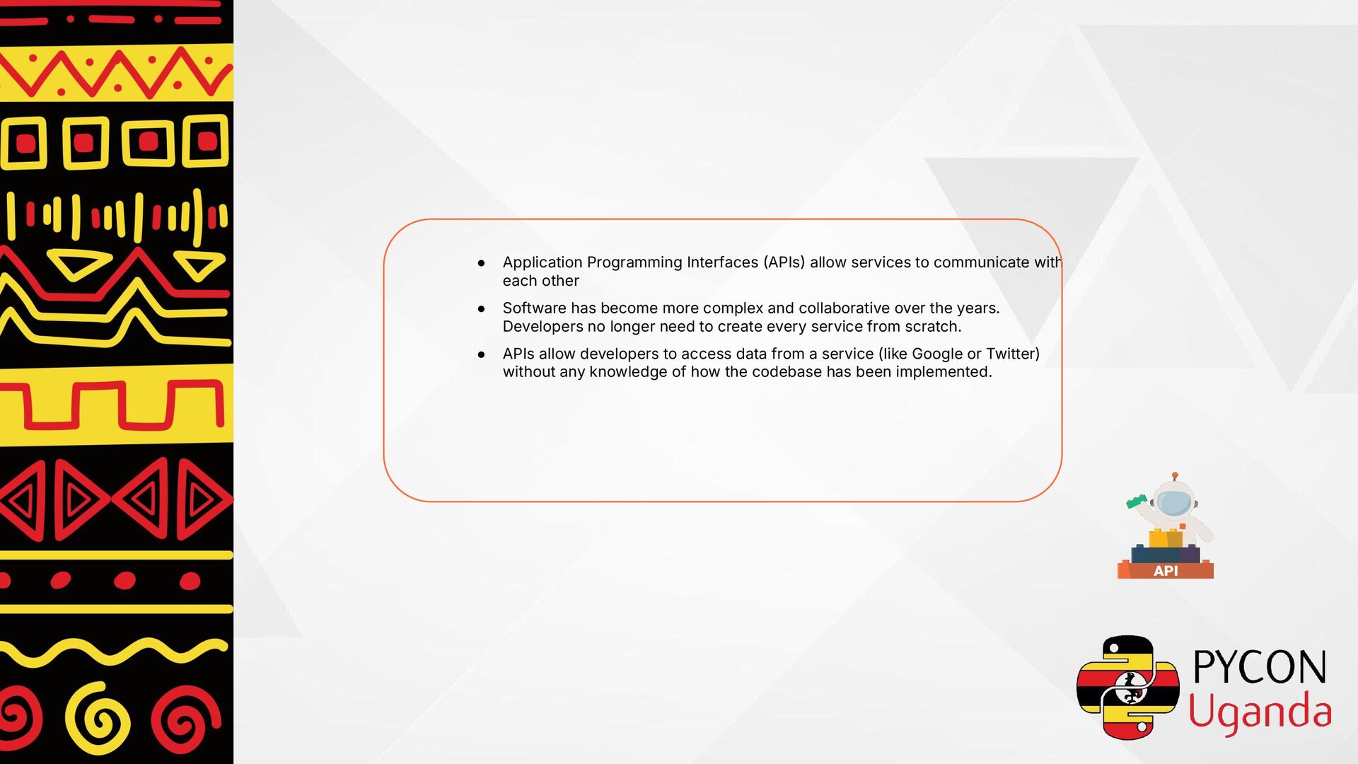 each other • Software has become more complex and collaborative over the years. Developers no longer need to create every service from scratch. • APIs allow developers to access data from a service (like Google or Twitter) without any knowledge of how the codebase has been implemented.