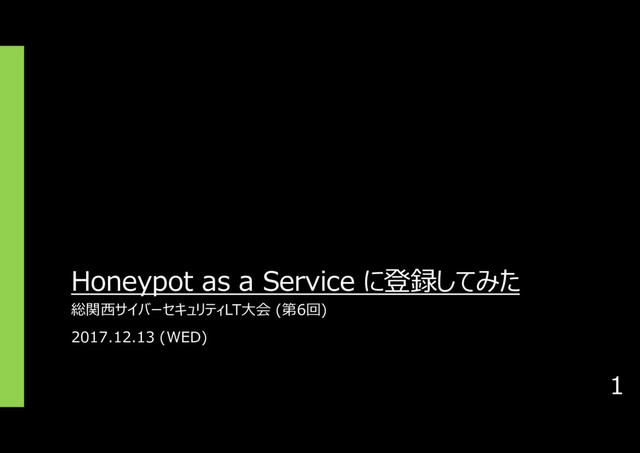 Honeypot as a Service に登録してみた 総関西サイバーセキュリティLT大会 (第6回) 2017.12.13 (WED) 1