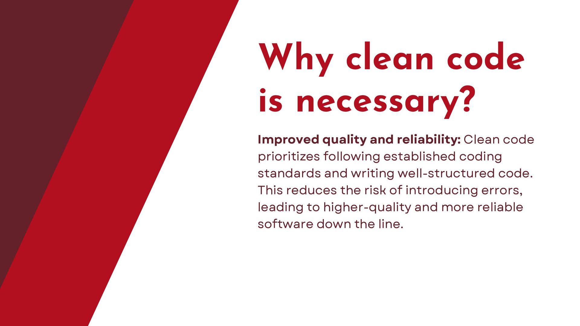 standards and writing well-structured code. This reduces the risk of introducing errors, leading to higher-quality and more reliable software down the line. Why clean code is necessary?