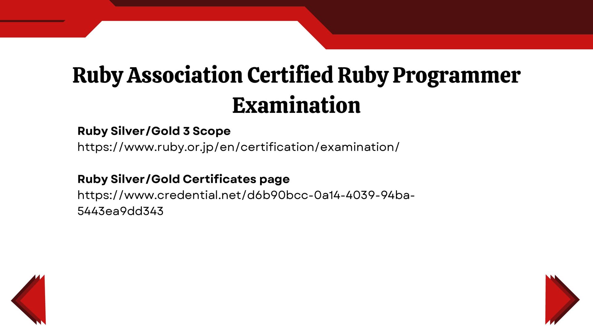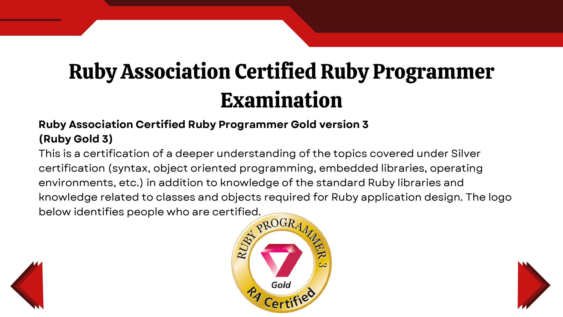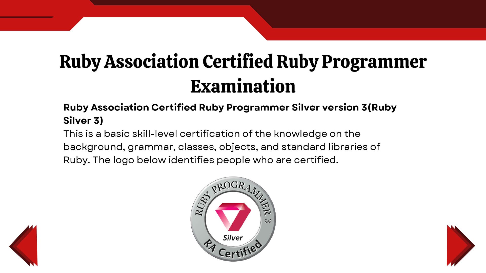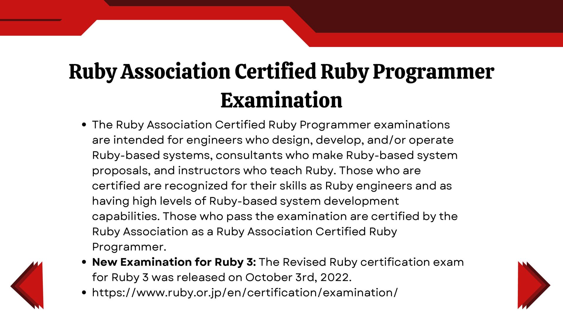 Ruby Programmer examinations are intended for engineers who design, develop, and/or operate Ruby-based systems, consultants who make Ruby-based system proposals, and instructors who teach Ruby. Those who are certified are recognized for their skills as Ruby engineers and as having high levels of Ruby-based system development capabilities. Those who pass the examination are certified by the Ruby Association as a Ruby Association Certified Ruby Programmer. New Examination for Ruby 3: The Revised Ruby certification exam for Ruby 3 was released on October 3rd, 2022. https://www.ruby.or.jp/en/certification/examination/