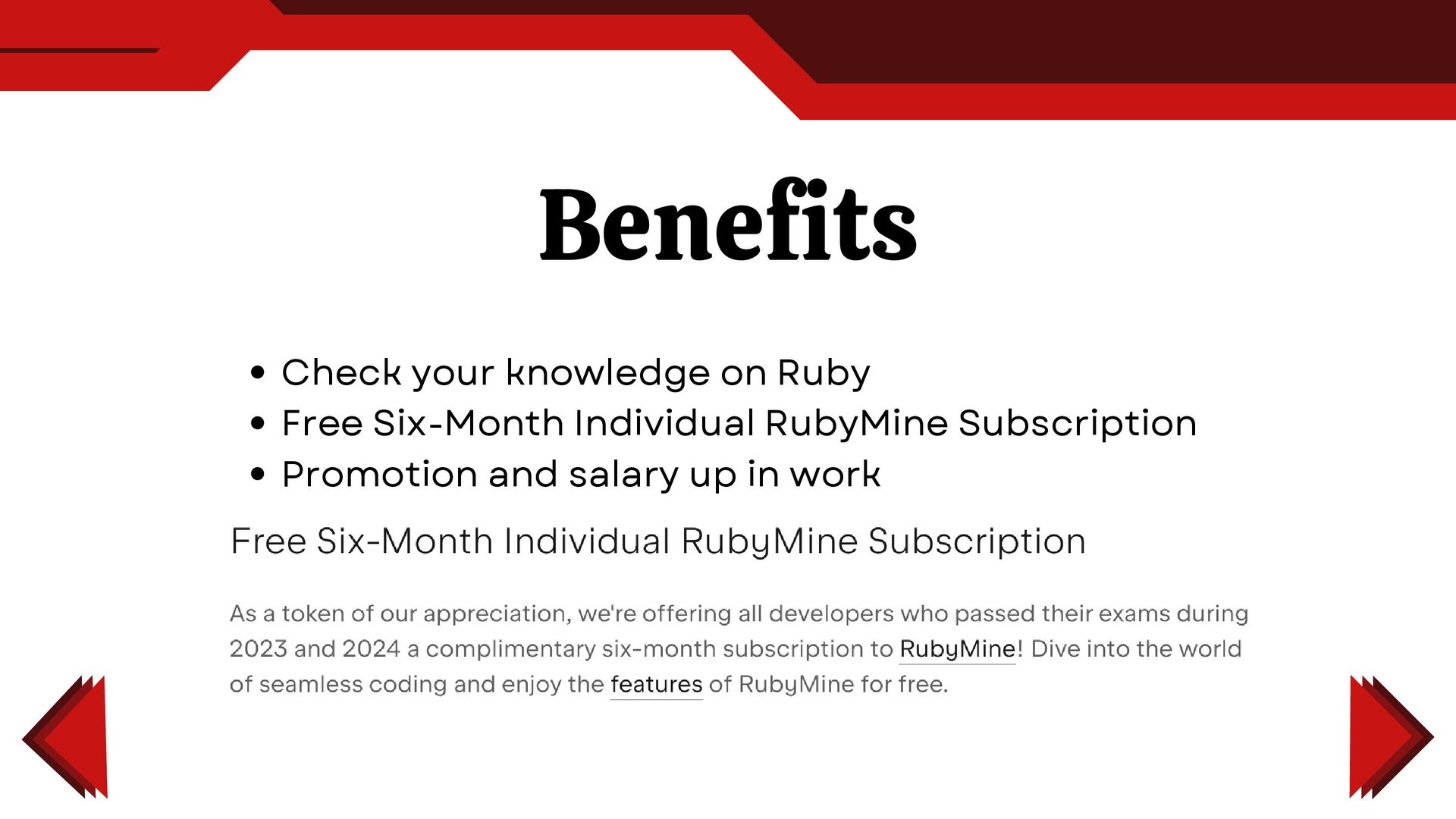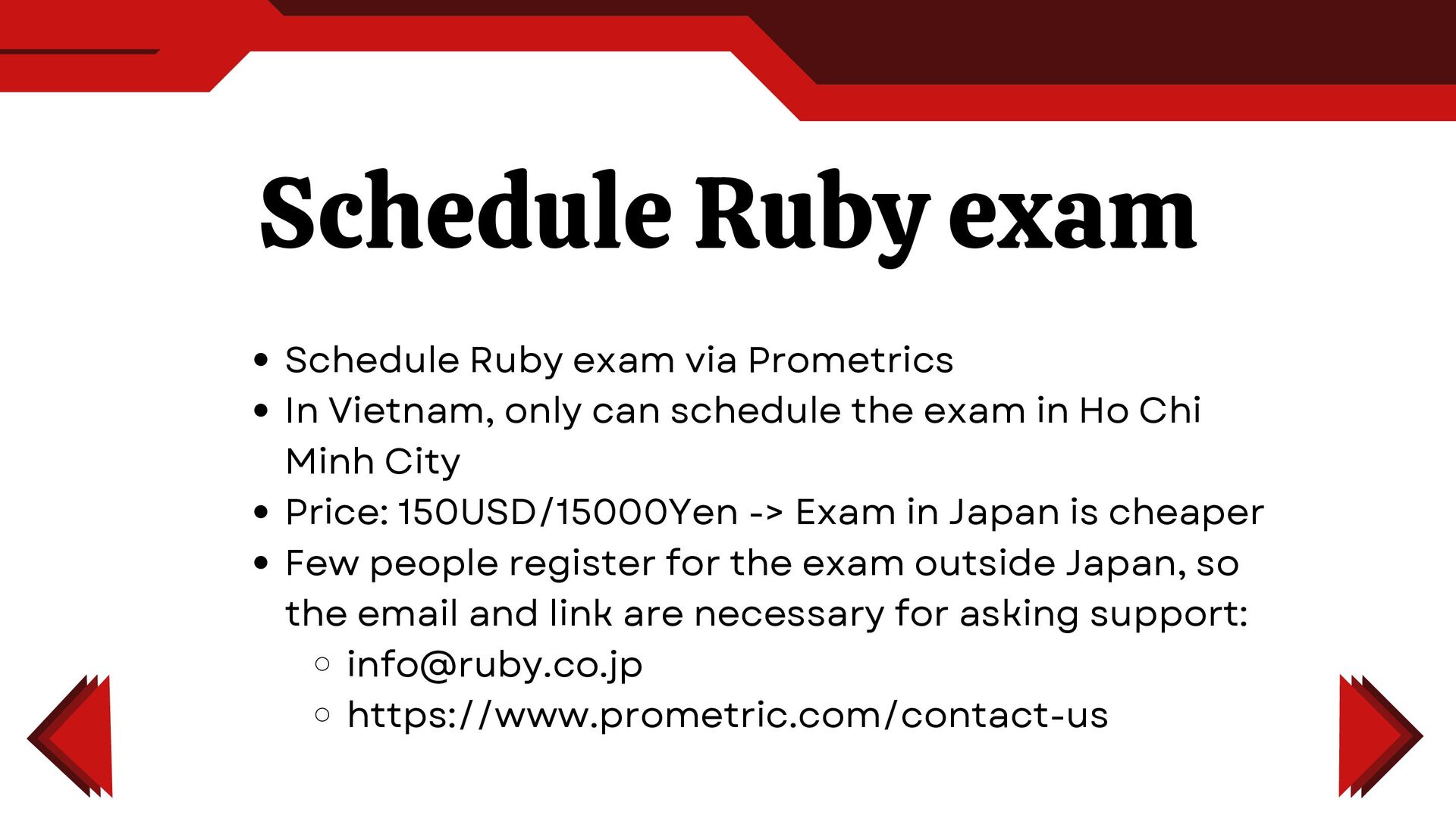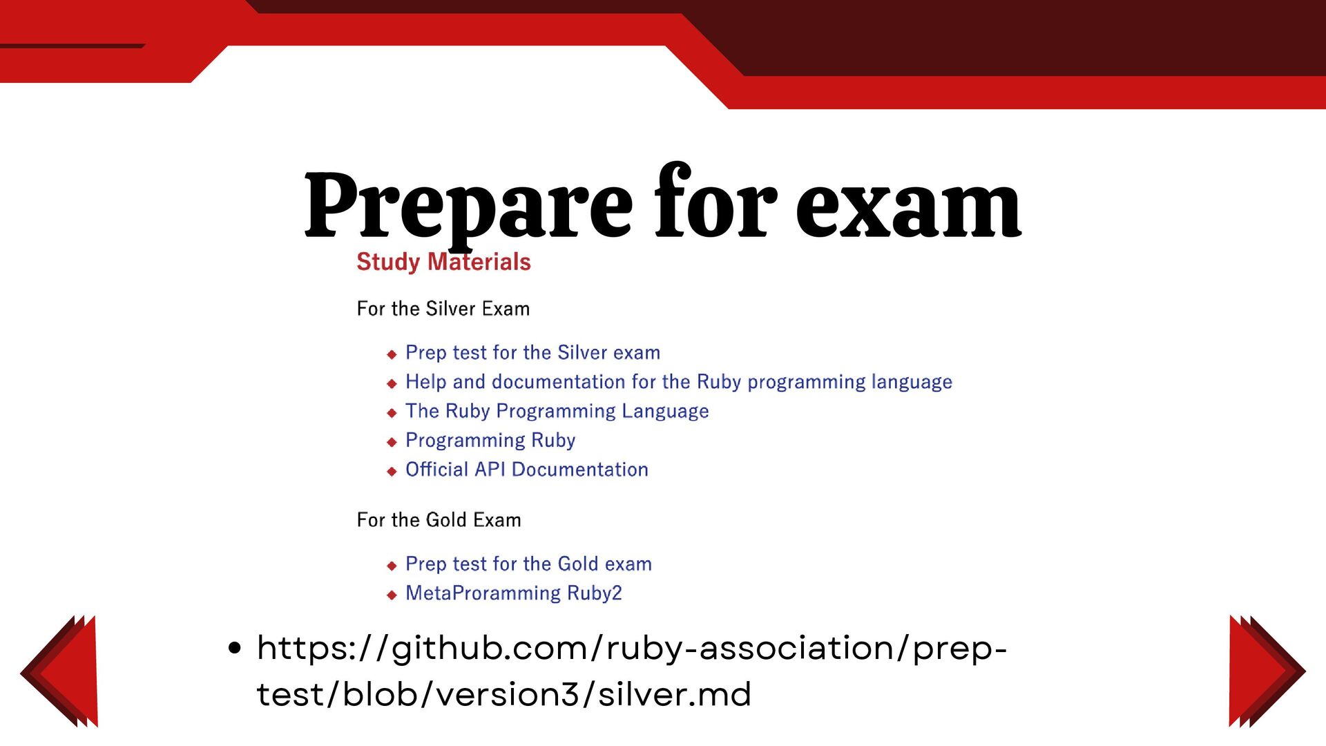 Ruby Programmer examinations are intended for engineers who design, develop, and/or operate Ruby-based systems, consultants who make Ruby-based system proposals, and instructors who teach Ruby. Those who are certified are recognized for their skills as Ruby engineers and as having high levels of Ruby-based system development capabilities. Those who pass the examination are certified by the Ruby Association as a Ruby Association Certified Ruby Programmer. New Examination for Ruby 3: The Revised Ruby certification exam for Ruby 3 was released on October 3rd, 2022. https://www.ruby.or.jp/en/certification/examination/