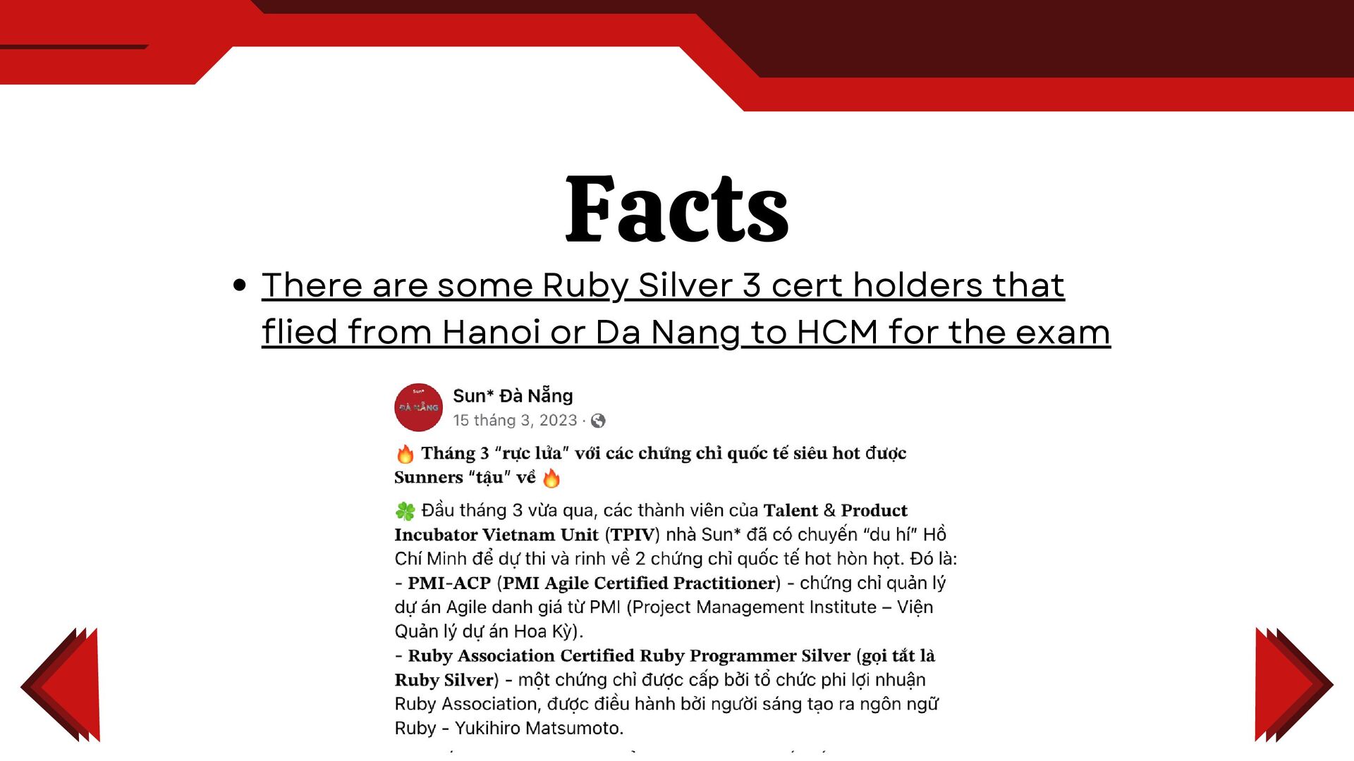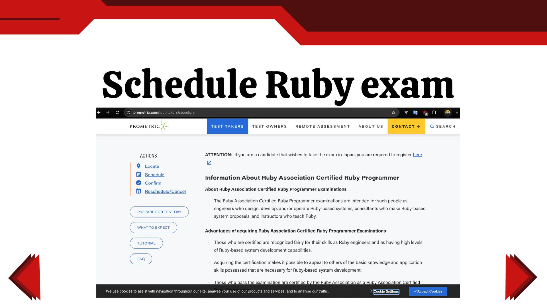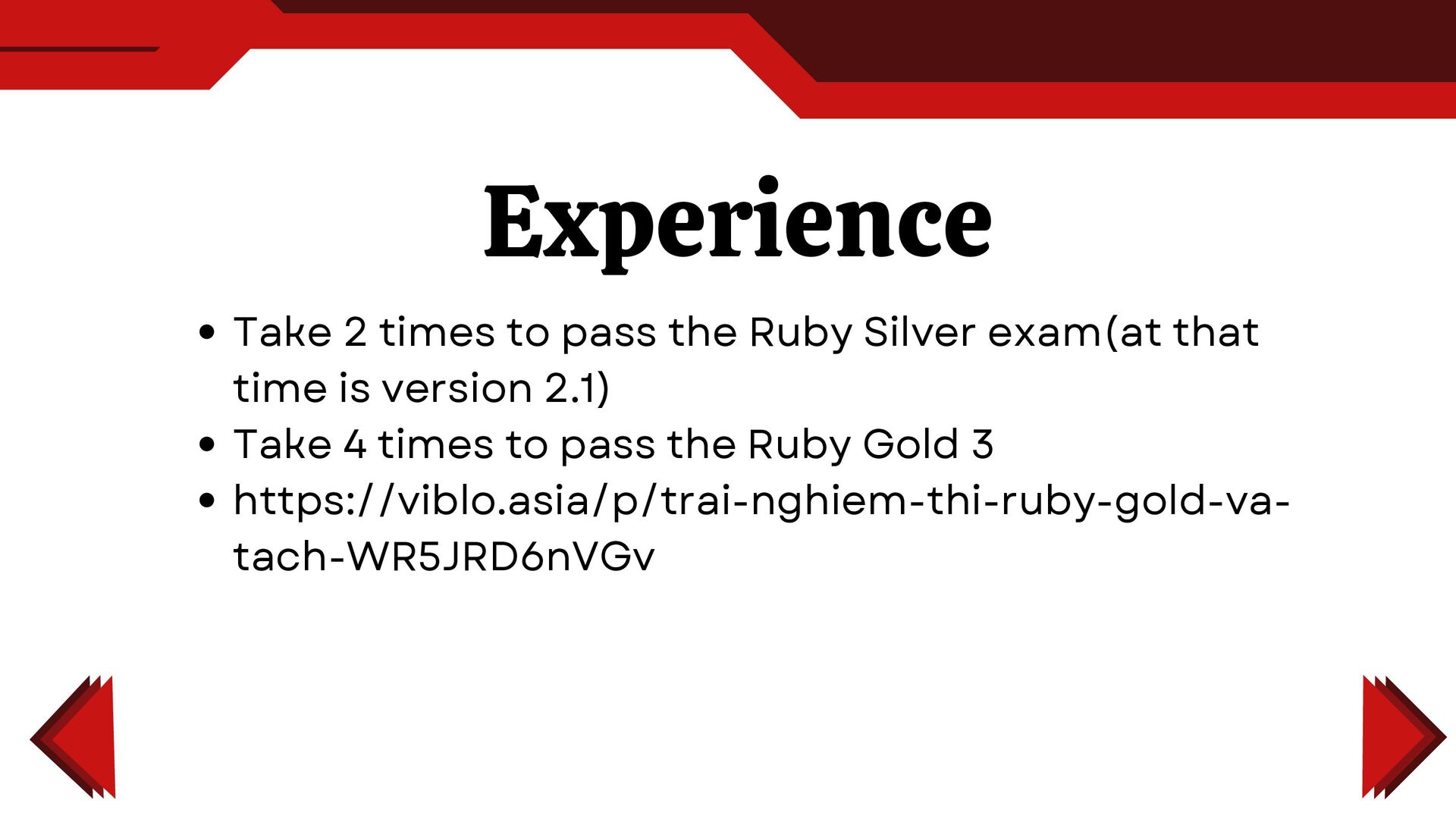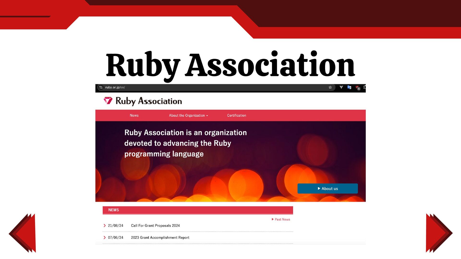 Ruby Programmer examinations are intended for engineers who design, develop, and/or operate Ruby-based systems, consultants who make Ruby-based system proposals, and instructors who teach Ruby. Those who are certified are recognized for their skills as Ruby engineers and as having high levels of Ruby-based system development capabilities. Those who pass the examination are certified by the Ruby Association as a Ruby Association Certified Ruby Programmer. New Examination for Ruby 3: The Revised Ruby certification exam for Ruby 3 was released on October 3rd, 2022. https://www.ruby.or.jp/en/certification/examination/