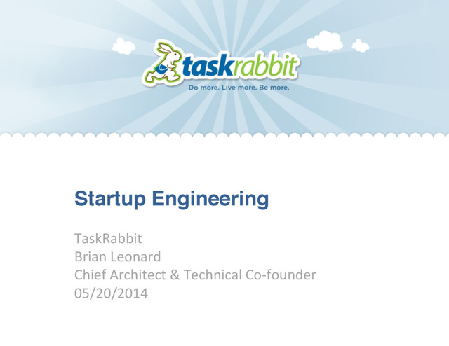 school for computer engineering in S. Carolina, worked at IBM in Boston, and moved my family to SF to launch TaskRabbit. • Chief Architect & Technical Co- founder • Built rebranded TaskRabbit site • Recruited/managed engineering team • Transitioned to Chief Architect Pic
