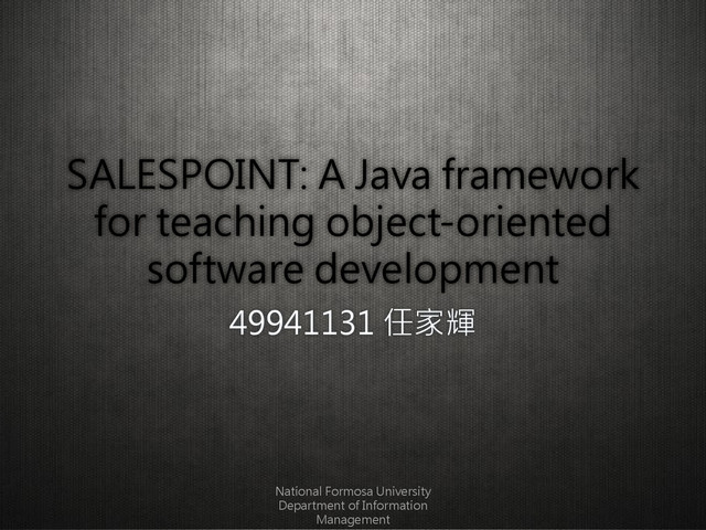 student projects since its inception in 1997; a total of approx. 4380 students have passed the project course. • In general, student reactions have been favorable: While many complain about the amount of work required, they enjoy the opportunity to work as a team on a realistic project for an extended period of time. • The reported total time effort including all project phases in this semester averaged 17.9 h per student and week. In subsequent discussions however, most students acknowledge the fact that learning real software development with ‘toy example applications’ is not possible. National Formosa University Department of Information Management