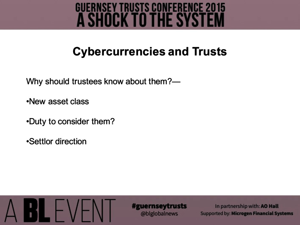 Why does it matter?— •“If you don’t understand it, you shouldn’t be in it” •If it’s not property you can’t hold it •If it’s not property you can’t “follow” or “trace” it •If it’s not money you can’t recover it as “money had and received” Cybercurrencies and Trusts