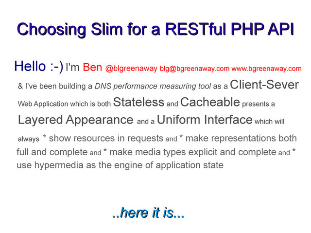 a RESTful PHP API Hello :-) I'm Ben @blgreenaway [email protected] www.bgreenaway.com & I've been building a DNS performance measuring tool as a Client-Sever Web Application which is both Stateless and Cacheable presents a Layered Appearance and a Uniform Interface which will always * show resources in requests and * make representations both full and complete and * make media types explicit and complete and * use hypermedia as the engine of application state ..here it is... ..here it is...