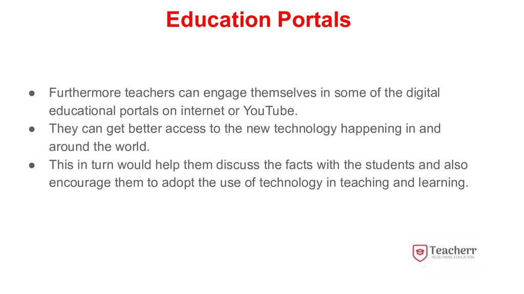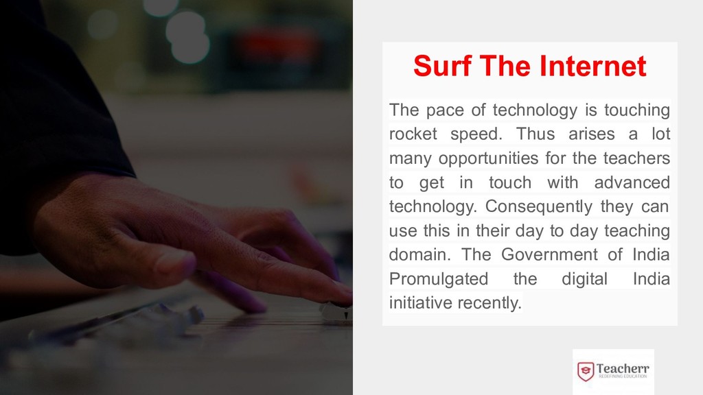 The pace of technology is touching rocket speed. Thus arises a lot many opportunities for the teachers to get in touch with advanced technology. Consequently they can use this in their day to day teaching domain. The Government of India Promulgated the digital India initiative recently.