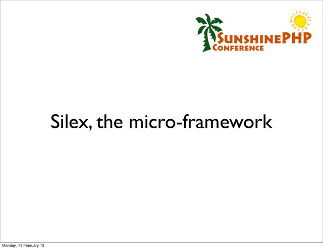 Standing on the shoulders of giants, Silex is a micro framework built on top of Symfony2 components. It provides an ideal environment for throwing together a simple, single file application. We’ll look at a real example of installing and setting up Silex and creating our first application with full dependency injection, templating and all the other features that you would expect of a modern day PHP framework. This session is recommended for anyone looking to break into the Symfony ecosystem with a simple introduction to a small framework build upon the core components of it’s bigger brother.