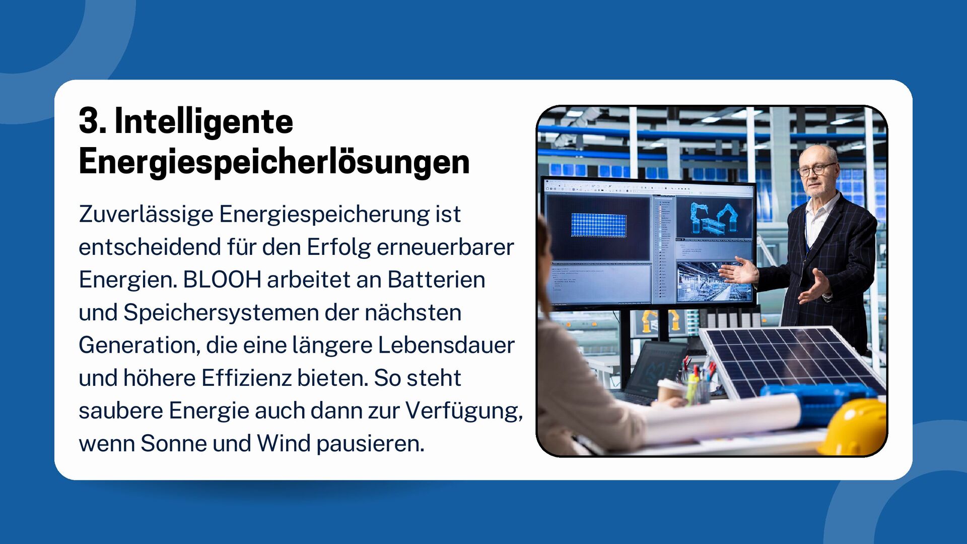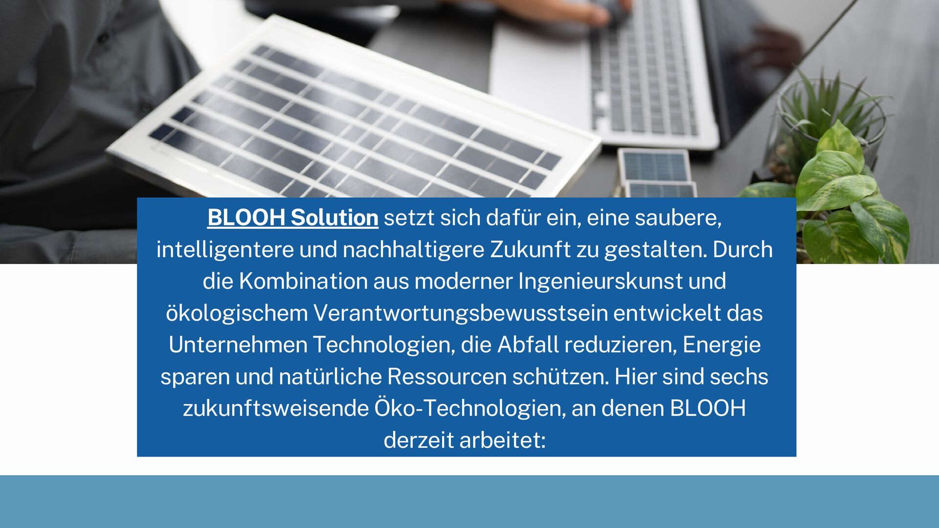 Diese Präsentation zeigt sechs innovative Umwelttechnologien, die BLOOH Solution für eine nachhaltige Zukunft entwickelt. Sie hebt moderne Lösungen in den Bereichen erneuerbare Energie, intelligente Speicherung, umweltfreundliche Materialien, Abfallreduzierung, emissionsarme Thermalsysteme und Wassermanagement hervor. Die Inhalte verdeutlichen, wie BLOOH technologische Grenzen erweitert, um Effizienz zu steigern und den Planeten langfristig zu schützen.