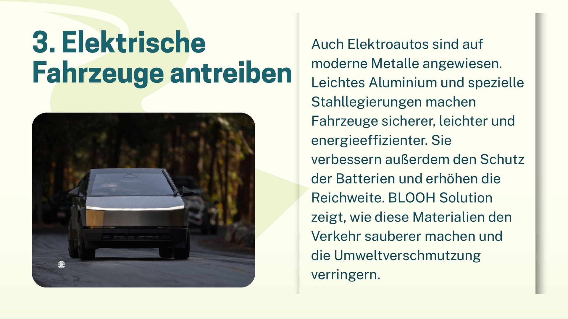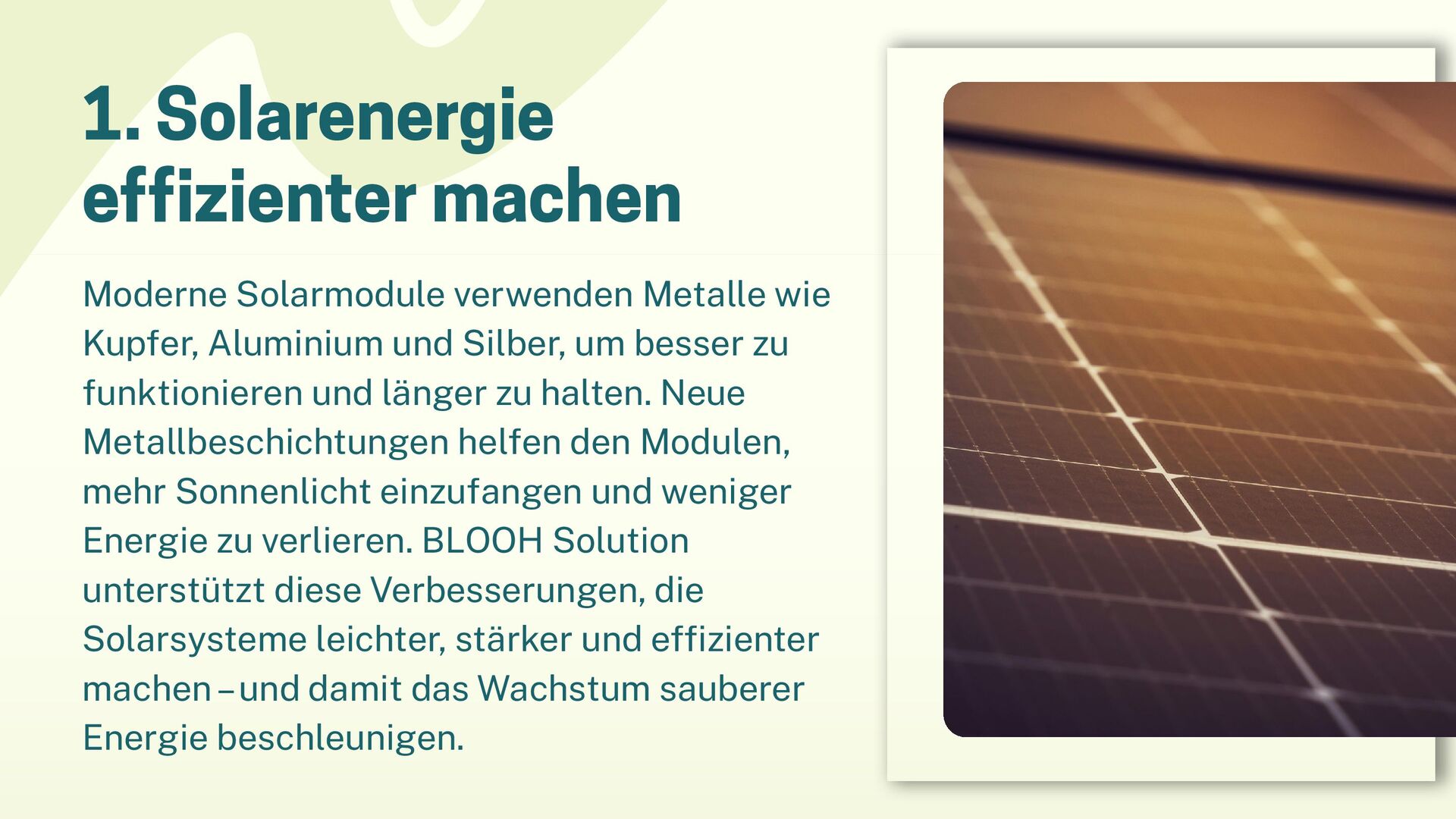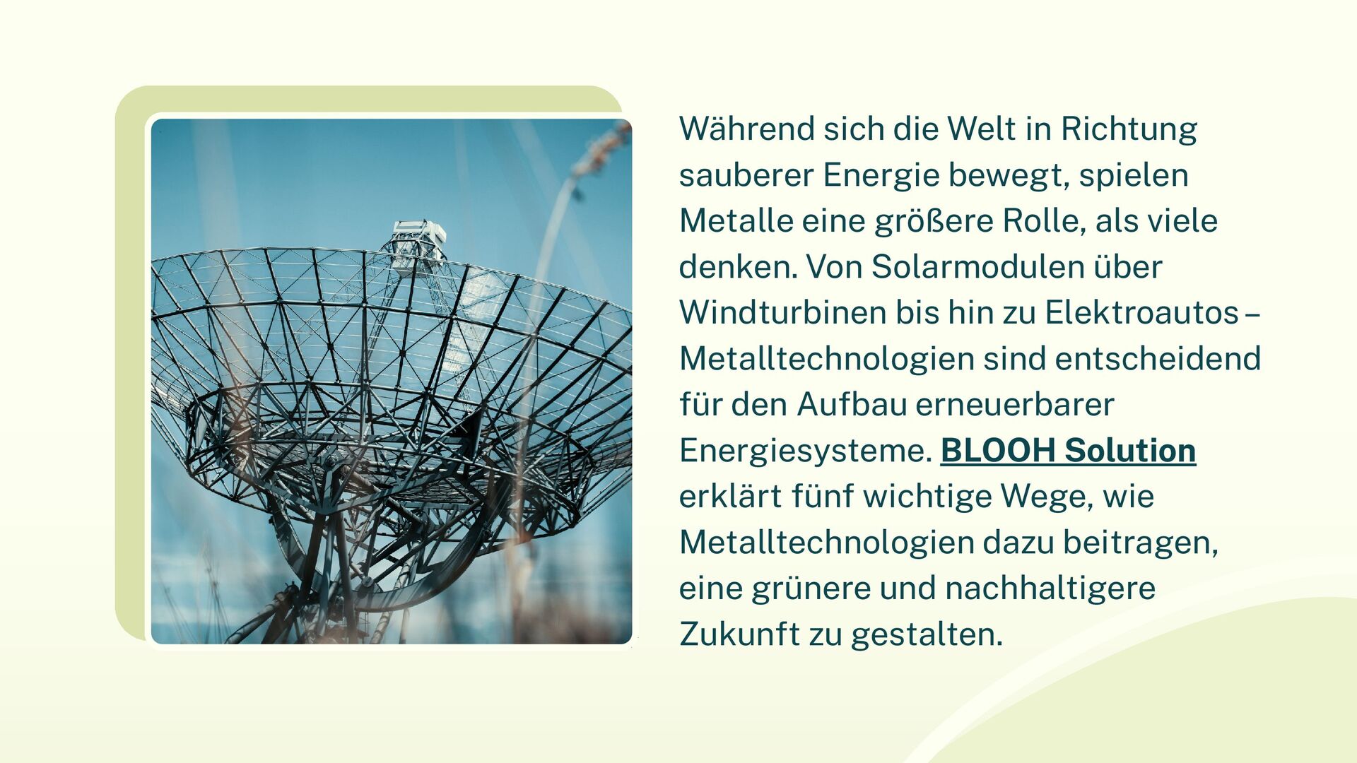 Diese Präsentation von BLOOH Solution zeigt, wie Metalltechnologien das Wachstum erneuerbarer Energien unterstützen. Sie erklärt, wie Metalle Solarmodule, Windturbinen, Elektrofahrzeuge und Batterien verbessern und gleichzeitig Recycling und Nachhaltigkeit fördern. Erfahre, wie der intelligente Einsatz von Metallen eine sauberere und grünere Zukunft gestaltet.