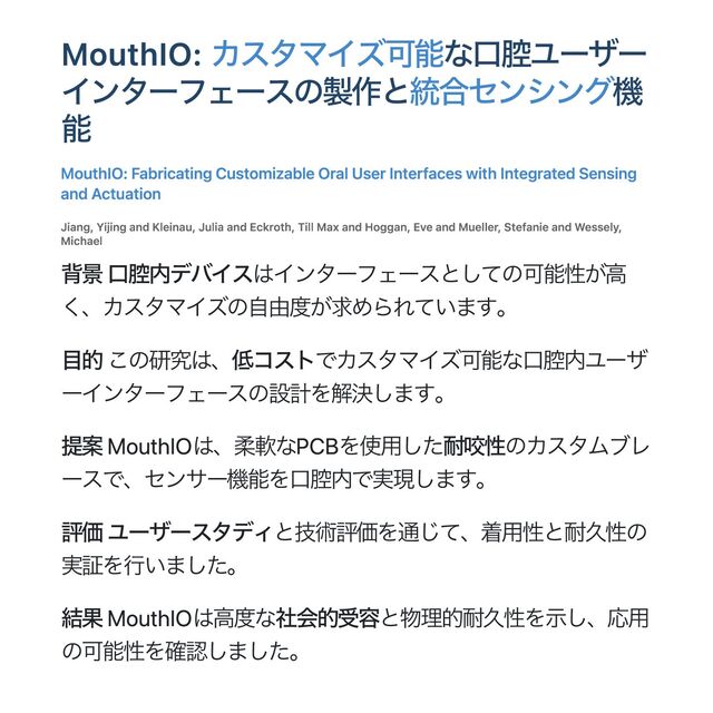 Multi-form, Multi-property and Multi- function Wang, Guanyun and Ji, Junzhe and Xu, Yunkai and Ren, Lei and Wu, Xiaoyang and Zheng, Chunyuan and Zhou, Xiaojing and Tang, Xin and Feng, Boyu and Sun, Lingyun and Tao, Ye and Li, Jiaji 背景 3D印刷技術の進展により、毛状構造の多様性が求められ ている。 目的 異なる形態・特性を持つ 3D印刷毛状構造の生成方法を開 発すること。 提案 二段階のサスペンド印刷戦略で、様々な毛状構造の生成を 可能にする方法を提案。 評価 異なるパラメータでの特性を評価し、設計空間と評価プロ セスを実施。 結果 実用性を示し、装飾、熱保存、触覚インタラクションなど を可能にする多機能を確認。