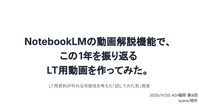 NotebookLMの動画解説機能で、 この1年を振り返る LT用動画を作ってみた。 LT用資料が作れる可能性を考えた「試してみた系」発表 ayane/綾祢 2025/11/20 AGI福岡 第8回