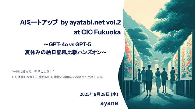 夏休みの絵日記風比較ハンズオン〜 2025年8⽉28⽇ (⽊) ayane “⼀緒に触って、発⾒しよう!” AIを体験しながら、⽣成AIの可能性と活⽤法をみなさんと話します。