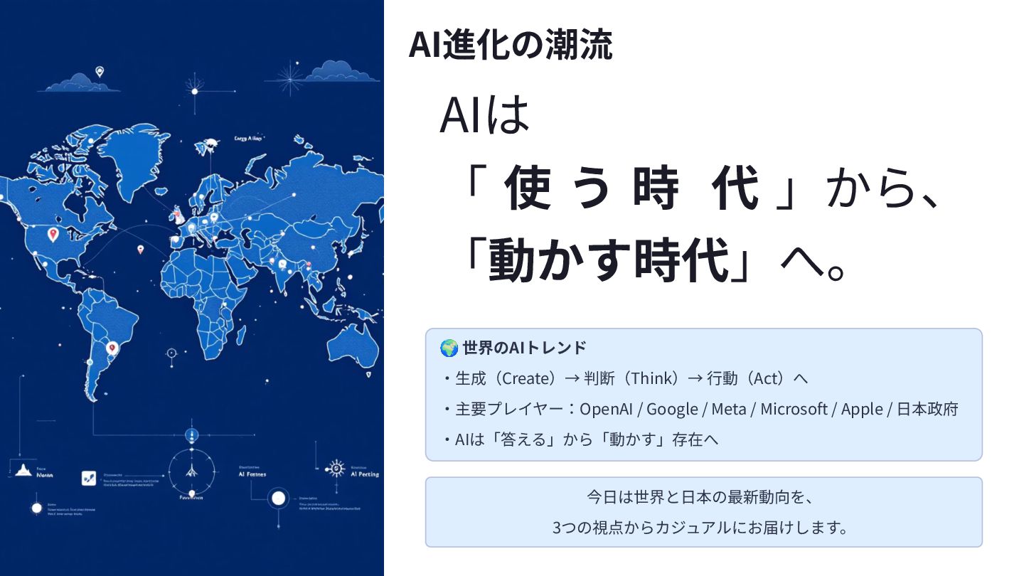 「AIを“使う”だけでなく、“動かす”時代へ」と変化する流れを、5分で振り返ります。