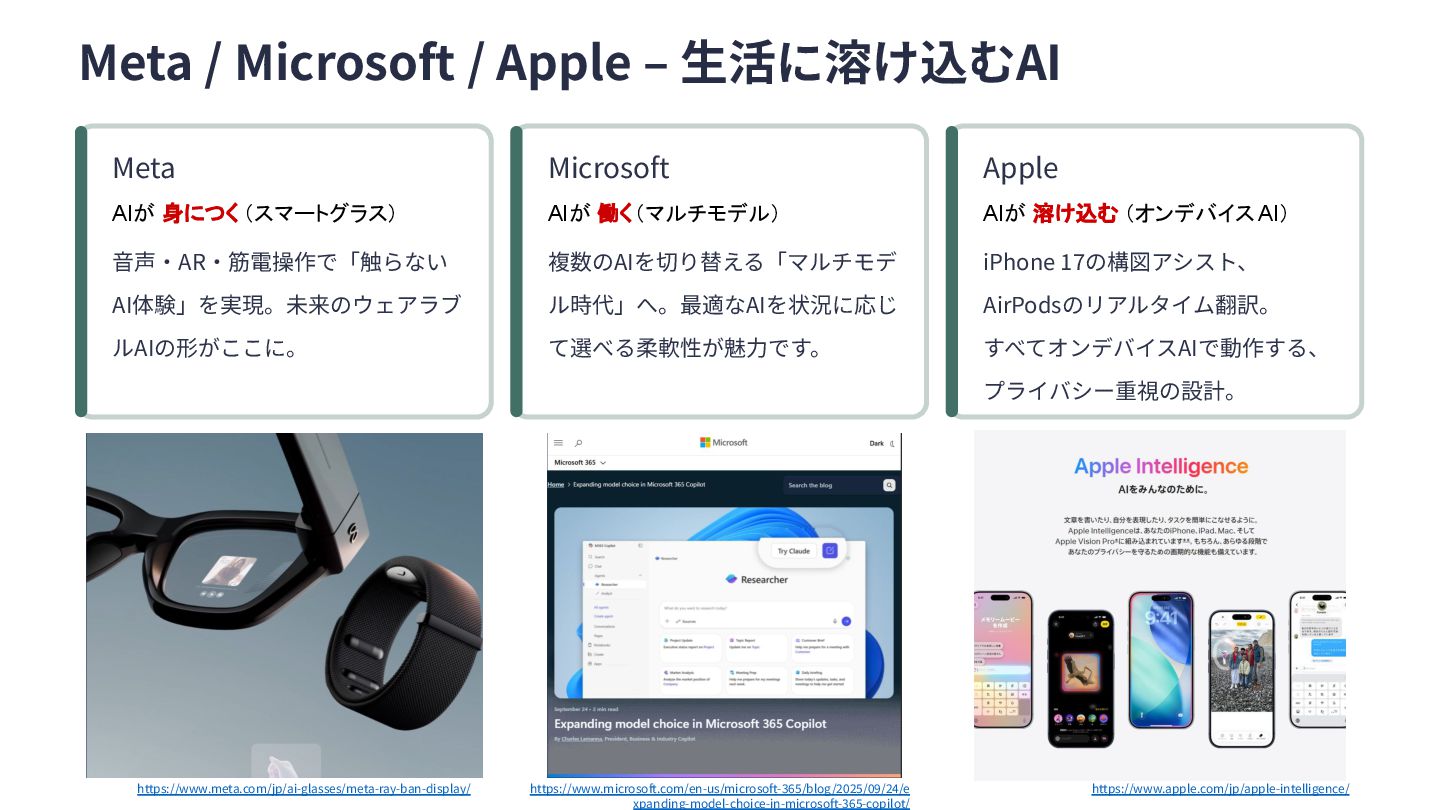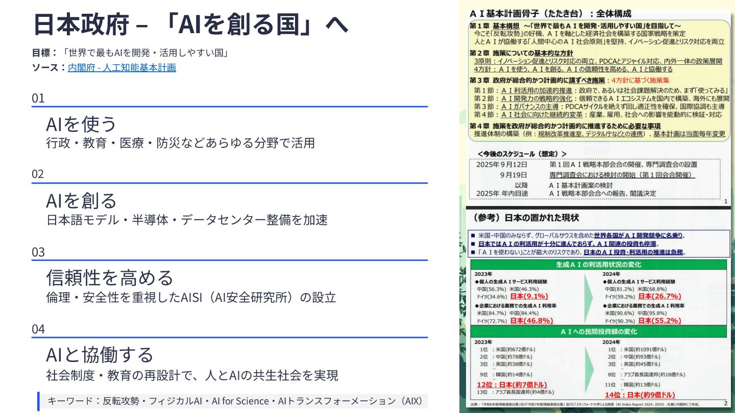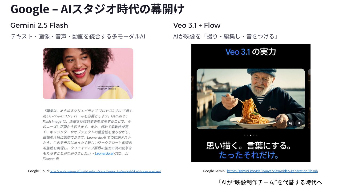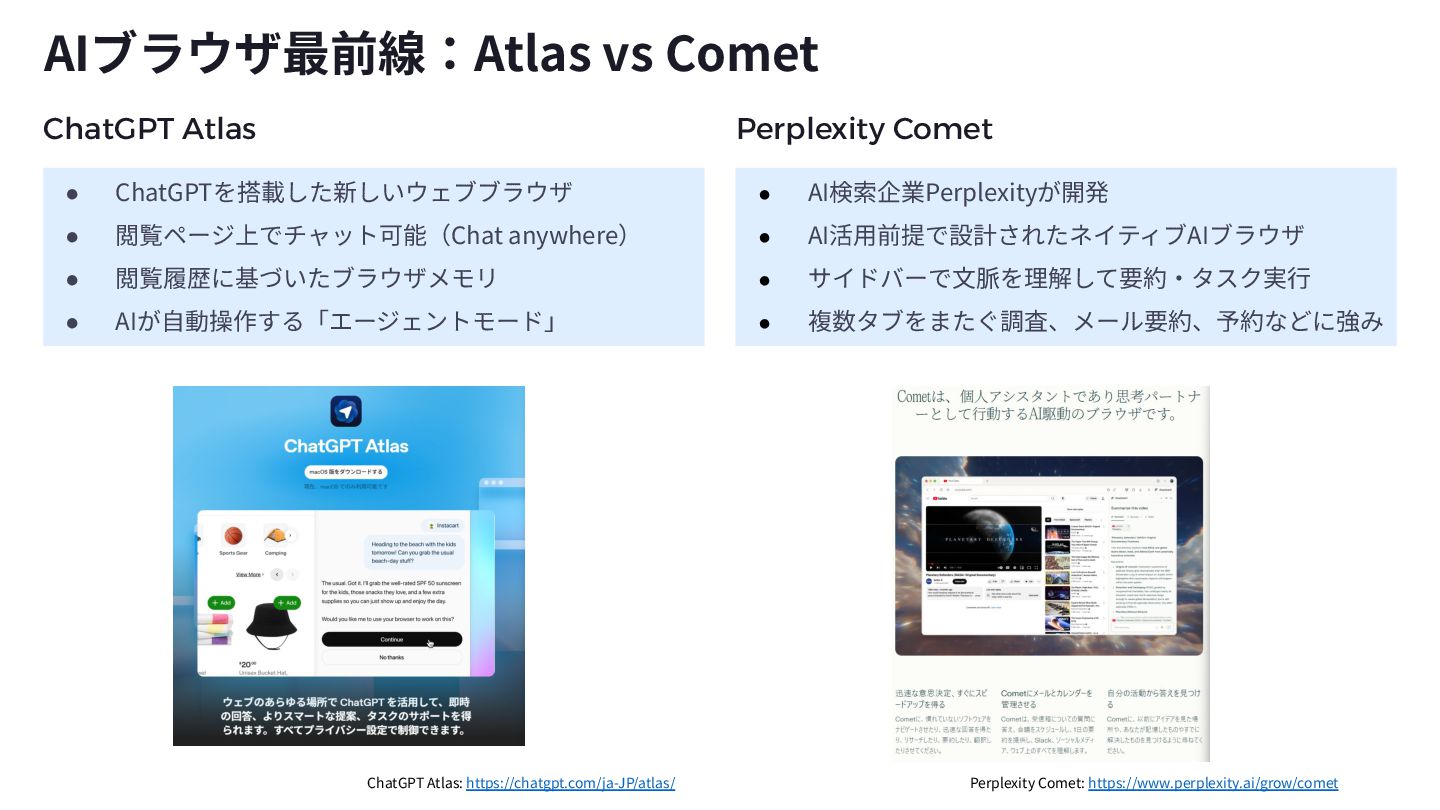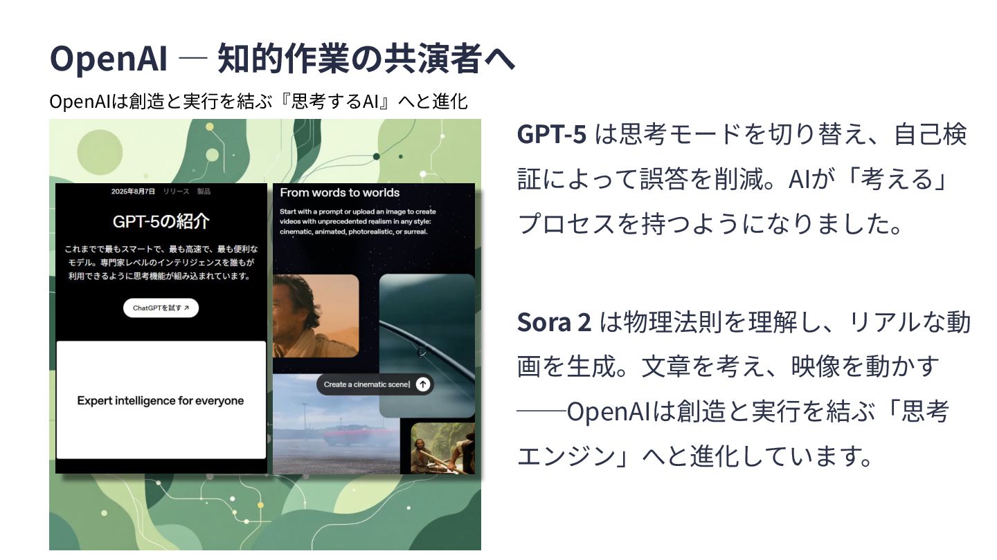 GPT-5、Gemini 2.5、Sora 2、Veo 3.1、ChatGPT Atlas、Perplexity Comet、そして日本政府のAI基本計画など、2025年秋の主要トピックをピックアップ。