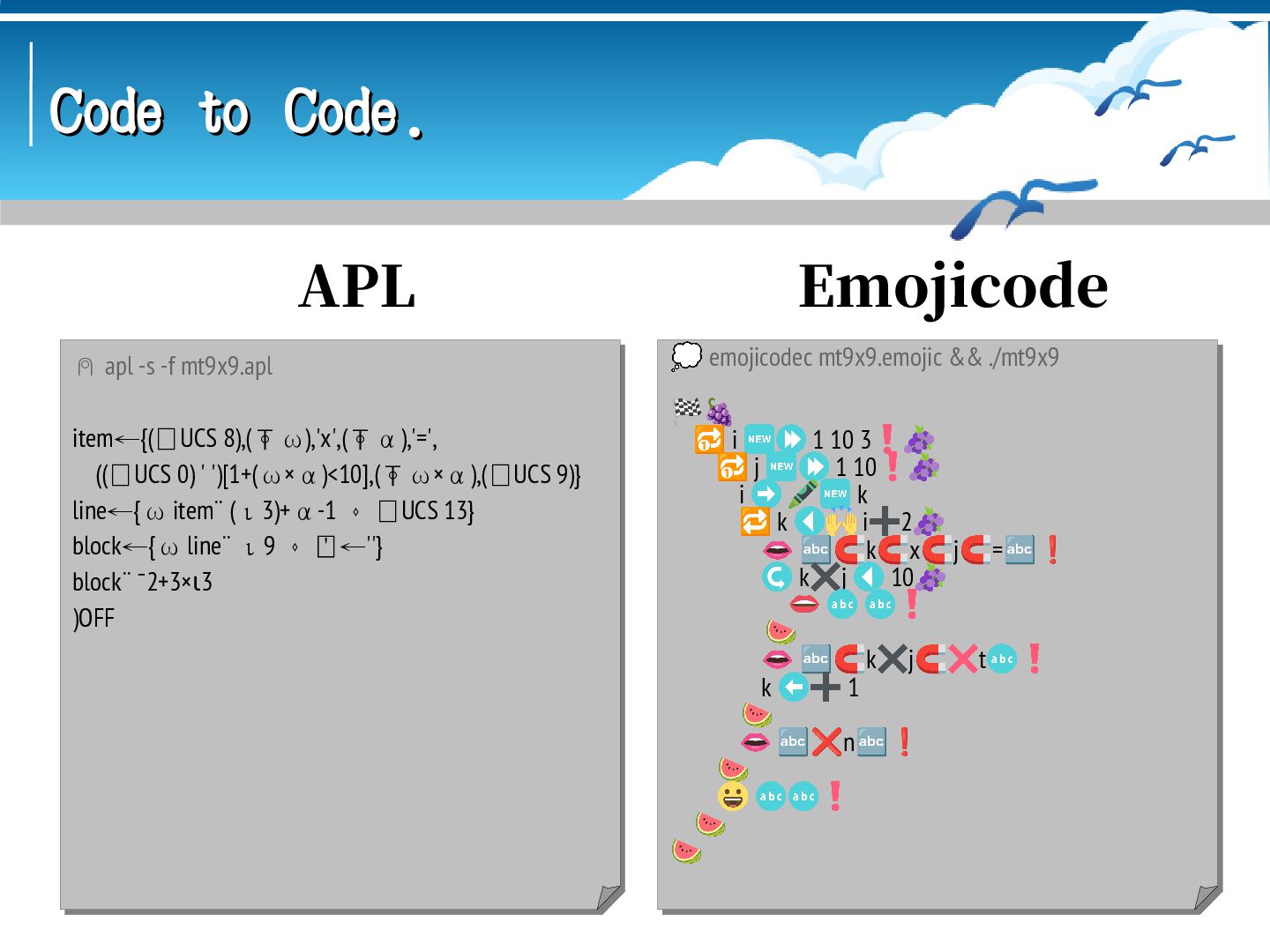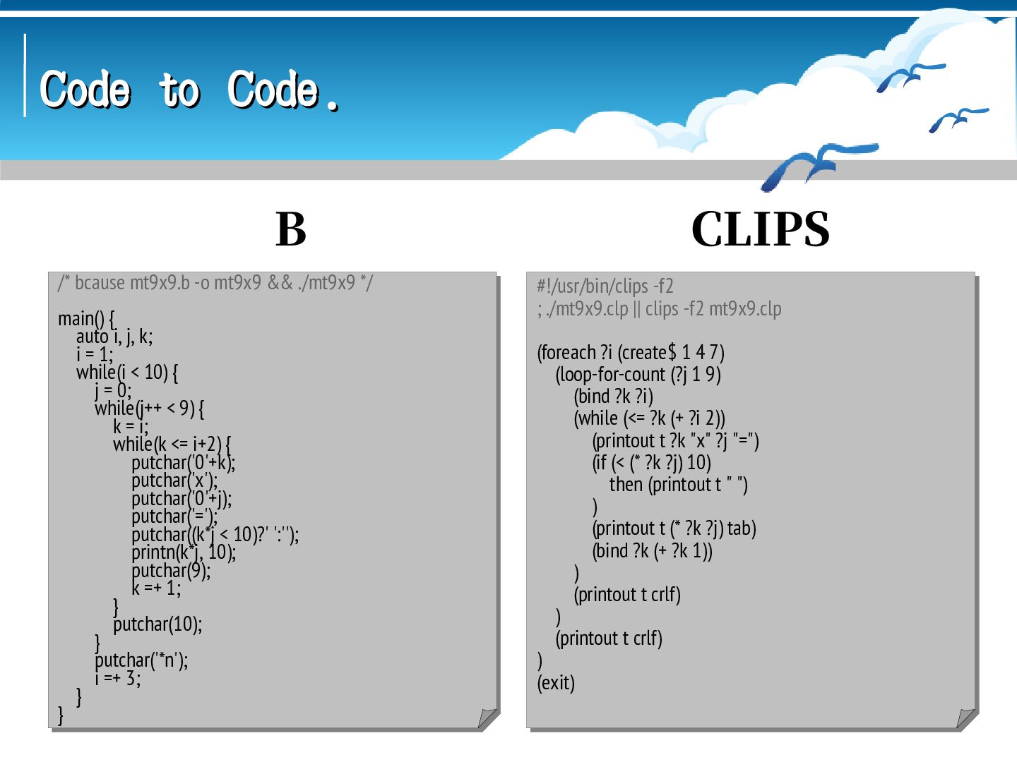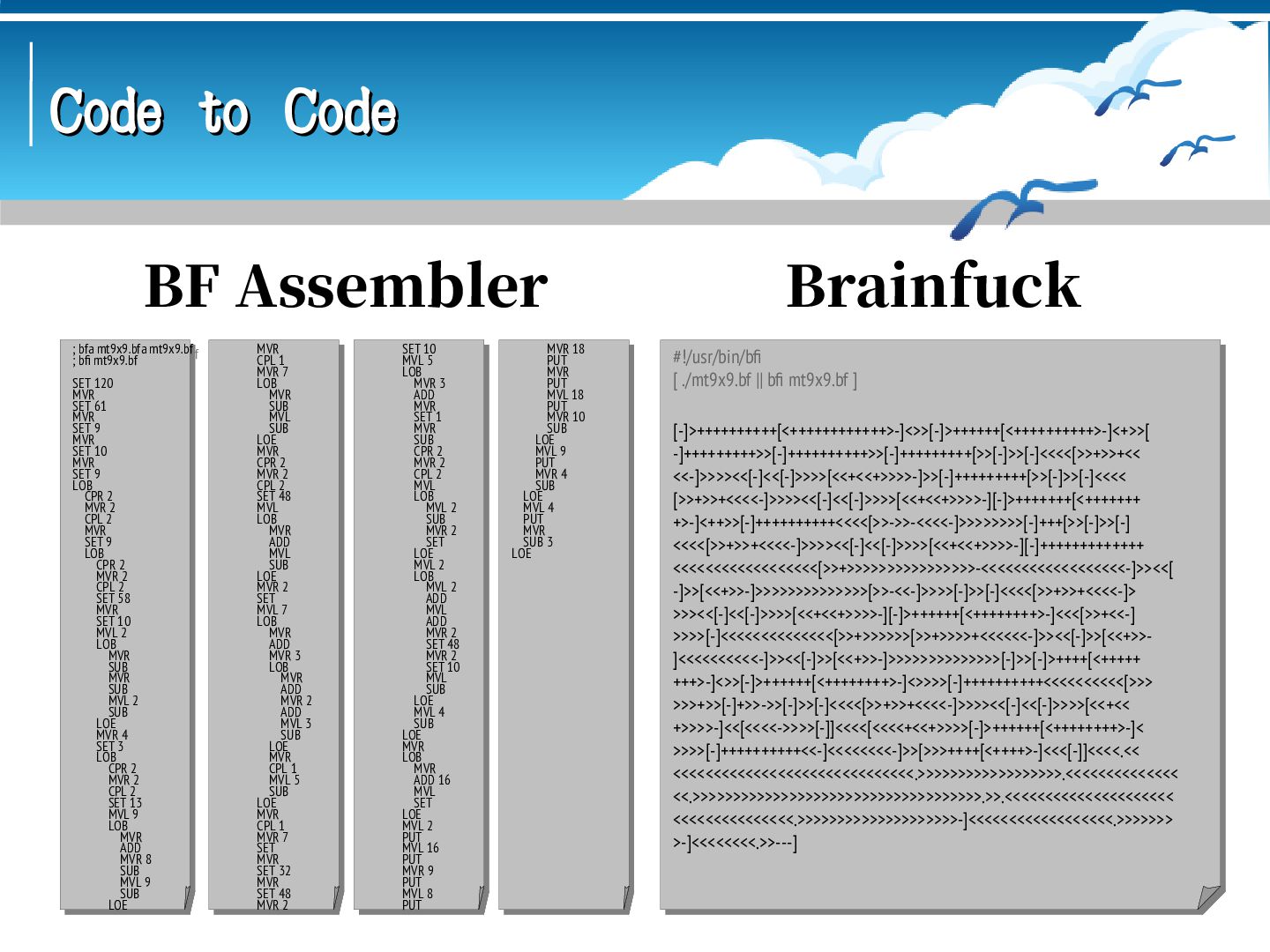 mt9x9.asm && ; ld mt9x9.o -o mt9x9 && ./mt9x9 GLOBAL _start SECTION .data i: DB 0 j: DB 0 k: DB 0 ten: DB 10 item: DB '9x9=81', 9 nl: DB 10 SECTION .text _start: MOV BYTE[i], 1 loop_i: MOV BYTE[j], 1 loop_j: MOV BYTE[k], 0 loop_k: MOV AL, [k] ADD AL, [i] ADD AL, 48 MOV BYTE[item], AL MOV AL, [j] ADD AL, 48 MOV BYTE[item+2], AL MOV AL, [k] ADD AL, [i] MUL BYTE[j] CMP AL, [ten] JB if_then DIV BYTE[ten] ADD AL, 48 MOV BYTE[item+4], AL ADD AH, 48 MOV BYTE[item+5], AH JMP if_end ; nasm -f elf64 mt9x9.asm && ; ld mt9x9.o -o mt9x9 && ./mt9x9 GLOBAL _start SECTION .data i: DB 0 j: DB 0 k: DB 0 ten: DB 10 item: DB '9x9=81', 9 nl: DB 10 SECTION .text _start: MOV BYTE[i], 1 loop_i: MOV BYTE[j], 1 loop_j: MOV BYTE[k], 0 loop_k: MOV AL, [k] ADD AL, [i] ADD AL, 48 MOV BYTE[item], AL MOV AL, [j] ADD AL, 48 MOV BYTE[item+2], AL MOV AL, [k] ADD AL, [i] MUL BYTE[j] CMP AL, [ten] JB if_then DIV BYTE[ten] ADD AL, 48 MOV BYTE[item+4], AL ADD AH, 48 MOV BYTE[item+5], AH JMP if_end Assembly(Intel) Assembly(AT&T) if_then: ADD AL, 48 MOV BYTE[item+4], ' ' MOV BYTE[item+5], AL if_end: MOV RAX, 1 MOV RDI, 1 MOV RSI, item MOV RDX, 7 SYSCALL INC BYTE[k] CMP BYTE[k], 2 JBE loop_k CALL newline INC BYTE[j] CMP BYTE[j], 9 JBE loop_j CALL newline ADD BYTE[i], 3 CMP BYTE[i], 9 JBE loop_i MOV RAX, 60 XOR RDI, RDI SYSCALL newline: MOV RAX, 1 MOV RDI, 1 MOV RSI, nl MOV RDX, 1 SYSCALL RET if_then: ADD AL, 48 MOV BYTE[item+4], ' ' MOV BYTE[item+5], AL if_end: MOV RAX, 1 MOV RDI, 1 MOV RSI, item MOV RDX, 7 SYSCALL INC BYTE[k] CMP BYTE[k], 2 JBE loop_k CALL newline INC BYTE[j] CMP BYTE[j], 9 JBE loop_j CALL newline ADD BYTE[i], 3 CMP BYTE[i], 9 JBE loop_i MOV RAX, 60 XOR RDI, RDI SYSCALL newline: MOV RAX, 1 MOV RDI, 1 MOV RSI, nl MOV RDX, 1 SYSCALL RET # as mt9x9.s -o mt9x9.o && # ld mt9x9.o -o mt9x9 && ./mt9x9 .global _start .data i: .byte 0 j: .byte 0 k: .byte 0 ten: .byte 10 item: .ascii "9x9=81\t" nl: .ascii "\n" .text _start: movb $1, i loop_i: movb $1, j loop_j: movb $0, k loop_k: movb k, %al addb i, %al addb $48, %al movb %al, item movb j, %al addb $48, %al movb %al, item+2 movb k, %al addb i, %al mulb j cmpb ten, %al jb if_then divb ten addb $48, %al movb %al, item+4 addb $48, %ah movb %ah, item+5 jmp if_end # as mt9x9.s -o mt9x9.o && # ld mt9x9.o -o mt9x9 && ./mt9x9 .global _start .data i: .byte 0 j: .byte 0 k: .byte 0 ten: .byte 10 item: .ascii "9x9=81\t" nl: .ascii "\n" .text _start: movb $1, i loop_i: movb $1, j loop_j: movb $0, k loop_k: movb k, %al addb i, %al addb $48, %al movb %al, item movb j, %al addb $48, %al movb %al, item+2 movb k, %al addb i, %al mulb j cmpb ten, %al jb if_then divb ten addb $48, %al movb %al, item+4 addb $48, %ah movb %ah, item+5 jmp if_end if_then: addb $48, %al movb $32, item+4 movb %al, item+5 if_end: mov $1, %rax mov $1, %rdi mov $item, %rsi mov $7, %rdx syscall incb k cmpb $2, k jbe loop_k call newline incb j cmpb $9, j jbe loop_j call newline addb $3, i cmpb $9, i jbe loop_i mov $60, %rax xor %rdi, %rdi syscall newline: mov $1, %rax mov $1, %rdi mov $nl, %rsi mov $1, %rdx syscall ret if_then: addb $48, %al movb $32, item+4 movb %al, item+5 if_end: mov $1, %rax mov $1, %rdi mov $item, %rsi mov $7, %rdx syscall incb k cmpb $2, k jbe loop_k call newline incb j cmpb $9, j jbe loop_j call newline addb $3, i cmpb $9, i jbe loop_i mov $60, %rax xor %rdi, %rdi syscall newline: mov $1, %rax mov $1, %rdi mov $nl, %rsi mov $1, %rdx syscall ret
