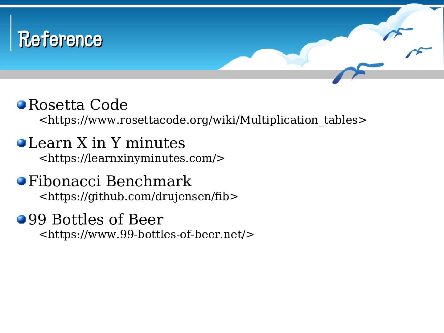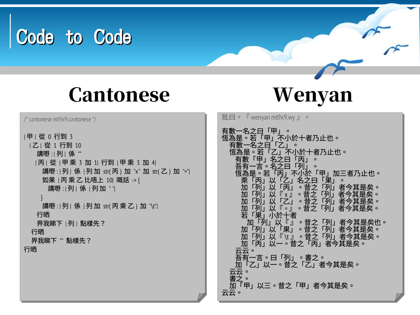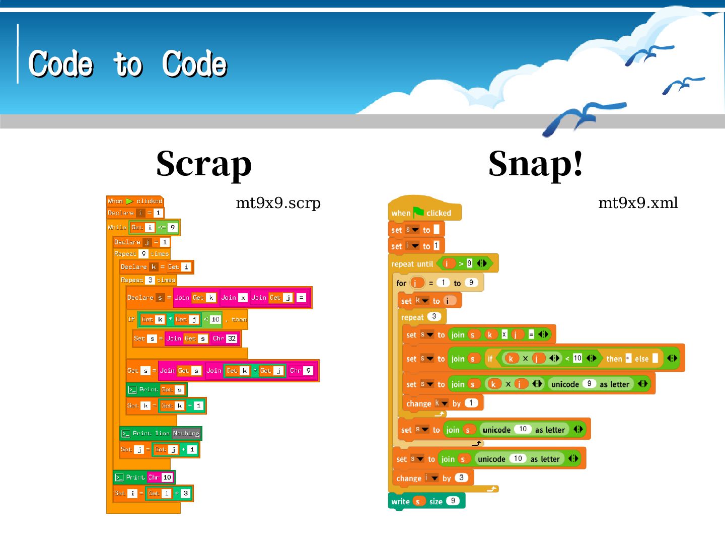 mt9x9.asm && ; ld mt9x9.o -o mt9x9 && ./mt9x9 GLOBAL _start SECTION .data i: DB 0 j: DB 0 k: DB 0 ten: DB 10 item: DB '9x9=81', 9 nl: DB 10 SECTION .text _start: MOV BYTE[i], 1 loop_i: MOV BYTE[j], 1 loop_j: MOV BYTE[k], 0 loop_k: MOV AL, [k] ADD AL, [i] ADD AL, 48 MOV BYTE[item], AL MOV AL, [j] ADD AL, 48 MOV BYTE[item+2], AL MOV AL, [k] ADD AL, [i] MUL BYTE[j] CMP AL, [ten] JB if_then DIV BYTE[ten] ADD AL, 48 MOV BYTE[item+4], AL ADD AH, 48 MOV BYTE[item+5], AH JMP if_end ; nasm -f elf64 mt9x9.asm && ; ld mt9x9.o -o mt9x9 && ./mt9x9 GLOBAL _start SECTION .data i: DB 0 j: DB 0 k: DB 0 ten: DB 10 item: DB '9x9=81', 9 nl: DB 10 SECTION .text _start: MOV BYTE[i], 1 loop_i: MOV BYTE[j], 1 loop_j: MOV BYTE[k], 0 loop_k: MOV AL, [k] ADD AL, [i] ADD AL, 48 MOV BYTE[item], AL MOV AL, [j] ADD AL, 48 MOV BYTE[item+2], AL MOV AL, [k] ADD AL, [i] MUL BYTE[j] CMP AL, [ten] JB if_then DIV BYTE[ten] ADD AL, 48 MOV BYTE[item+4], AL ADD AH, 48 MOV BYTE[item+5], AH JMP if_end Assembly(Intel) Assembly(AT&T) if_then: ADD AL, 48 MOV BYTE[item+4], ' ' MOV BYTE[item+5], AL if_end: MOV RAX, 1 MOV RDI, 1 MOV RSI, item MOV RDX, 7 SYSCALL INC BYTE[k] CMP BYTE[k], 2 JBE loop_k CALL newline INC BYTE[j] CMP BYTE[j], 9 JBE loop_j CALL newline ADD BYTE[i], 3 CMP BYTE[i], 9 JBE loop_i MOV RAX, 60 XOR RDI, RDI SYSCALL newline: MOV RAX, 1 MOV RDI, 1 MOV RSI, nl MOV RDX, 1 SYSCALL RET if_then: ADD AL, 48 MOV BYTE[item+4], ' ' MOV BYTE[item+5], AL if_end: MOV RAX, 1 MOV RDI, 1 MOV RSI, item MOV RDX, 7 SYSCALL INC BYTE[k] CMP BYTE[k], 2 JBE loop_k CALL newline INC BYTE[j] CMP BYTE[j], 9 JBE loop_j CALL newline ADD BYTE[i], 3 CMP BYTE[i], 9 JBE loop_i MOV RAX, 60 XOR RDI, RDI SYSCALL newline: MOV RAX, 1 MOV RDI, 1 MOV RSI, nl MOV RDX, 1 SYSCALL RET # as mt9x9.s -o mt9x9.o && # ld mt9x9.o -o mt9x9 && ./mt9x9 .global _start .data i: .byte 0 j: .byte 0 k: .byte 0 ten: .byte 10 item: .ascii "9x9=81\t" nl: .ascii "\n" .text _start: movb $1, i loop_i: movb $1, j loop_j: movb $0, k loop_k: movb k, %al addb i, %al addb $48, %al movb %al, item movb j, %al addb $48, %al movb %al, item+2 movb k, %al addb i, %al mulb j cmpb ten, %al jb if_then divb ten addb $48, %al movb %al, item+4 addb $48, %ah movb %ah, item+5 jmp if_end # as mt9x9.s -o mt9x9.o && # ld mt9x9.o -o mt9x9 && ./mt9x9 .global _start .data i: .byte 0 j: .byte 0 k: .byte 0 ten: .byte 10 item: .ascii "9x9=81\t" nl: .ascii "\n" .text _start: movb $1, i loop_i: movb $1, j loop_j: movb $0, k loop_k: movb k, %al addb i, %al addb $48, %al movb %al, item movb j, %al addb $48, %al movb %al, item+2 movb k, %al addb i, %al mulb j cmpb ten, %al jb if_then divb ten addb $48, %al movb %al, item+4 addb $48, %ah movb %ah, item+5 jmp if_end if_then: addb $48, %al movb $32, item+4 movb %al, item+5 if_end: mov $1, %rax mov $1, %rdi mov $item, %rsi mov $7, %rdx syscall incb k cmpb $2, k jbe loop_k call newline incb j cmpb $9, j jbe loop_j call newline addb $3, i cmpb $9, i jbe loop_i mov $60, %rax xor %rdi, %rdi syscall newline: mov $1, %rax mov $1, %rdi mov $nl, %rsi mov $1, %rdx syscall ret if_then: addb $48, %al movb $32, item+4 movb %al, item+5 if_end: mov $1, %rax mov $1, %rdi mov $item, %rsi mov $7, %rdx syscall incb k cmpb $2, k jbe loop_k call newline incb j cmpb $9, j jbe loop_j call newline addb $3, i cmpb $9, i jbe loop_i mov $60, %rax xor %rdi, %rdi syscall newline: mov $1, %rax mov $1, %rdi mov $nl, %rsi mov $1, %rdx syscall ret
