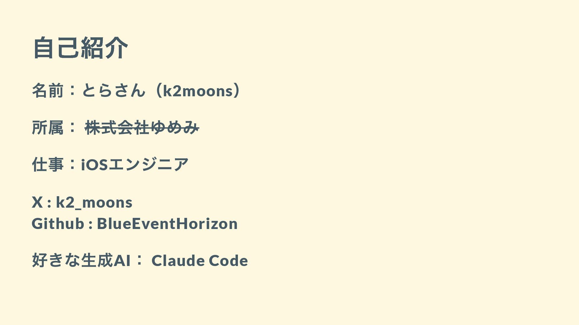 自己紹介 名前:とらさん(k2moons ) 所属: 株式会社ゆめみ 仕事:iOS エンジニア X : k2_moons