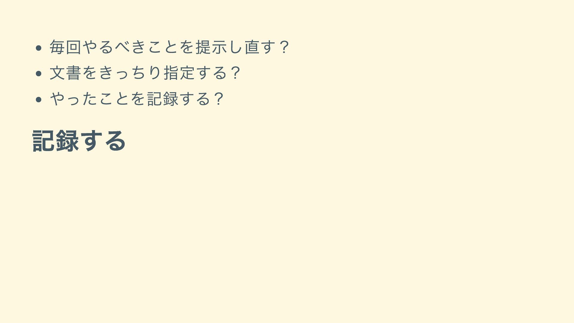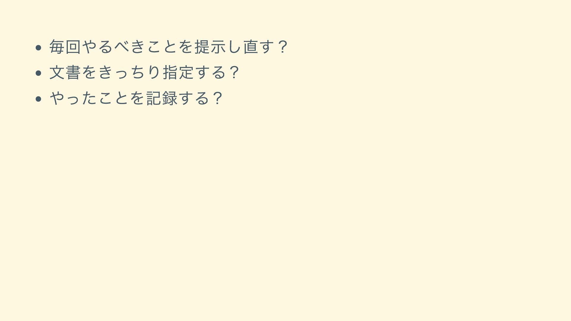 毎回やるべきことを提示し直す? 文書をきっちり指定する? やったことを記録する?