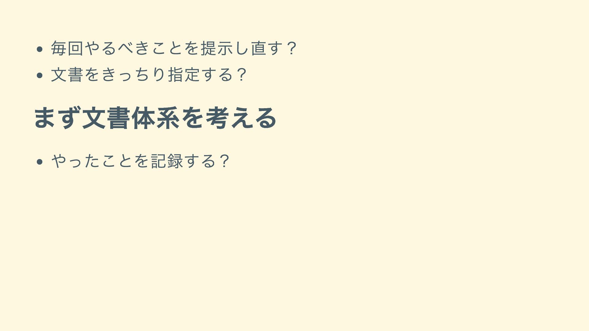 毎回やるべきことを提示し直す? 文書をきっちり指定する? まず文書体系を考える やったことを記録する?