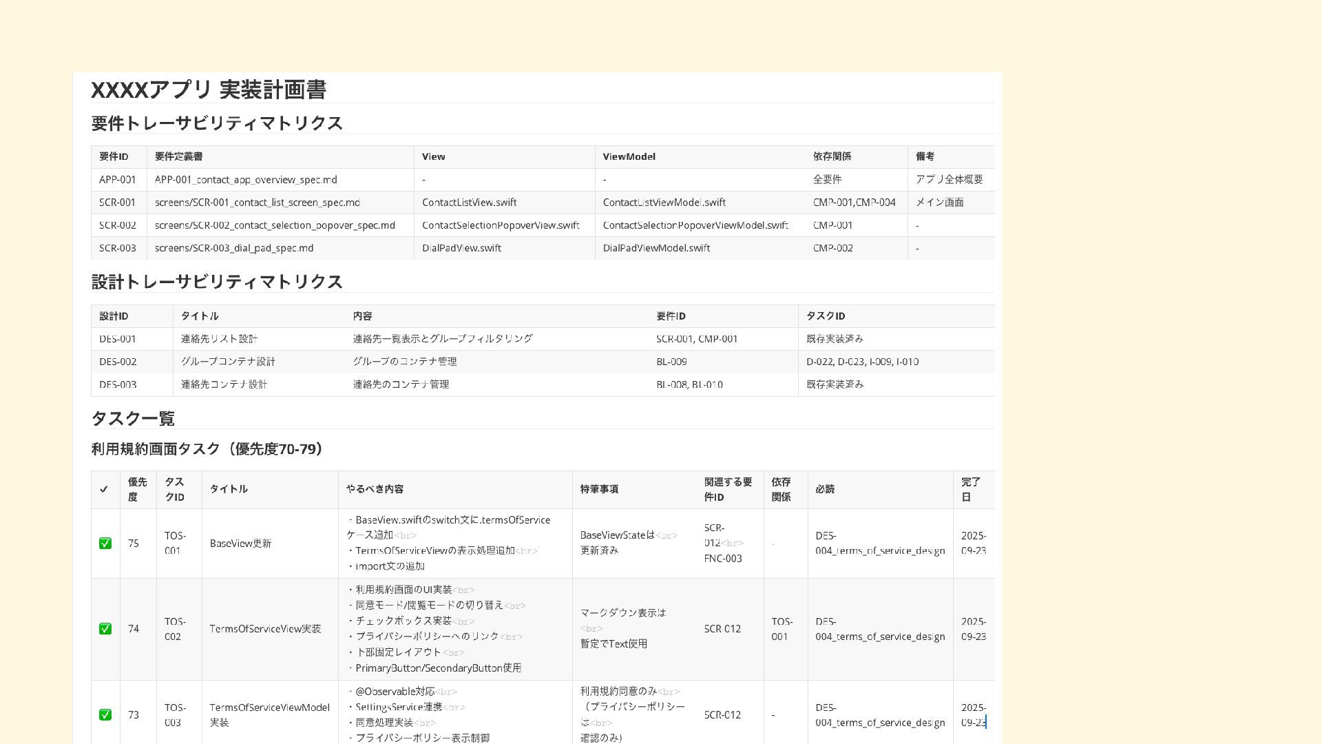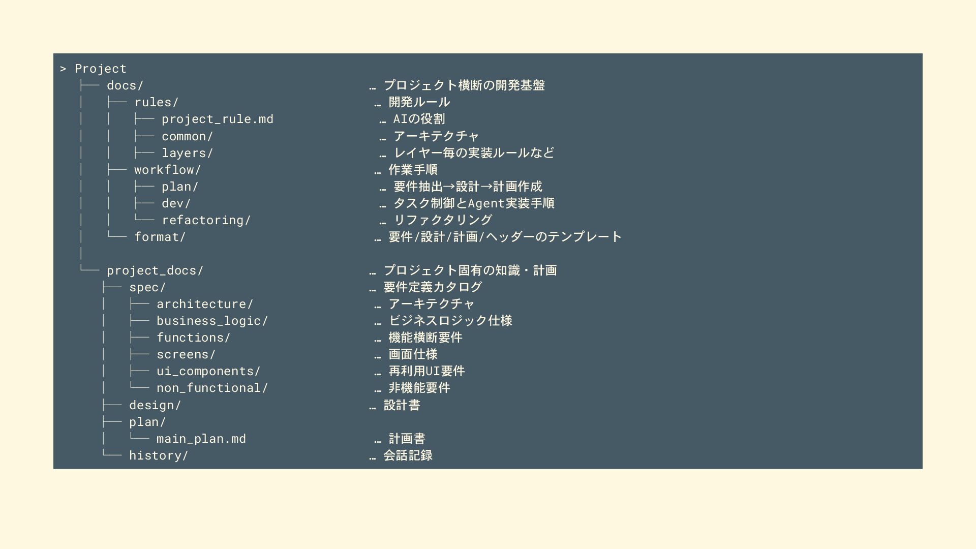 開発ルール │ │ ├─ project_rule.md … AIの役割 │ │ ├─ common/ … アーキテクチャ │ │ ├─ layers/ … レイヤー毎の実装ルールなど │ ├─ workflow/ … 作業手順 │ │ ├─ plan/ … 要件抽出→設計→計画作成 │ │ ├─ dev/ … タスク制御とAgent実装手順 │ │ └─ refactoring/ … リファクタリング │ └─ format/ … 要件/設計/計画/ヘッダーのテンプレート │ └─ project_docs/ … プロジェクト固有の知識・計画 ├─ spec/ … 要件定義カタログ │ ├─ architecture/ … アーキテクチャ │ ├─ business_logic/ … ビジネスロジック仕様 │ ├─ functions/ … 機能横断要件 │ ├─ screens/ … 画面仕様 │ ├─ ui_components/ … 再利用UI要件 │ └─ non_functional/ … 非機能要件 ├─ design/ … 設計書 ├─ plan/ │ └─ main_plan.md … 計画書 └─ history/ … 会話記録