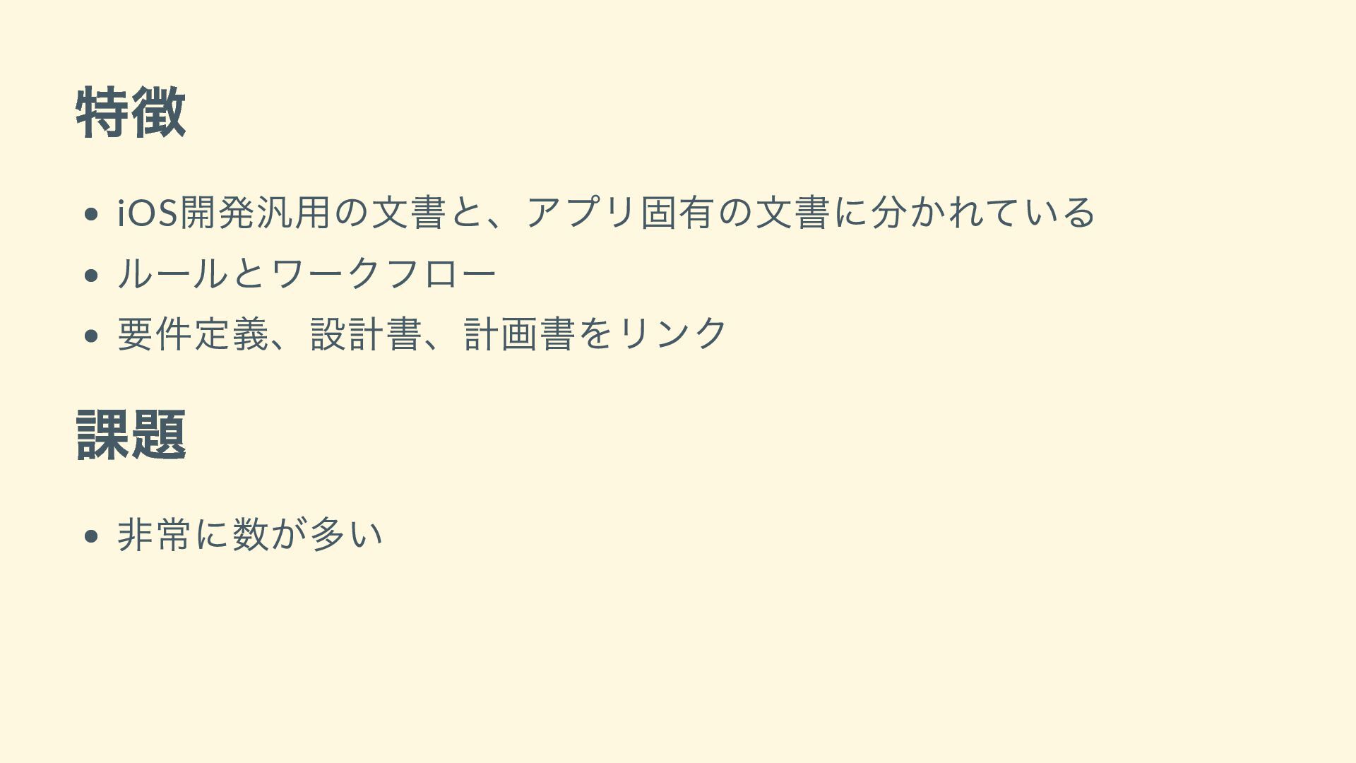 特徴 iOS 開発汎用の文書と、アプリ固有の文書に分かれている ルールとワークフロー 要件定義、設計書、計画書をリンク 課題 非常に数が多い