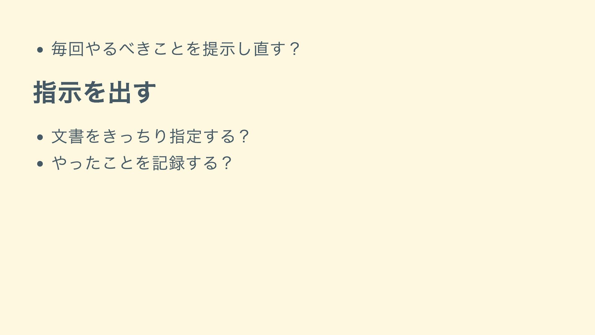 毎回やるべきことを提示し直す? 指示を出す 文書をきっちり指定する? やったことを記録する?