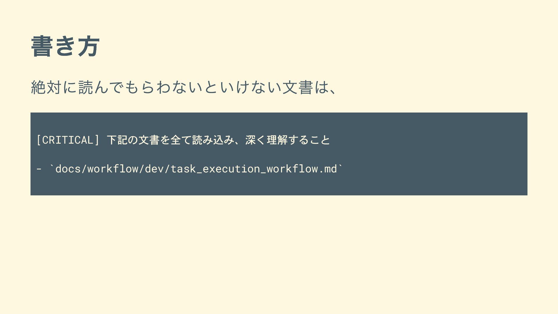 書き方 絶対に読んでもらわないといけない文書は、 [CRITICAL] 下記の文書を全て読み込み、深く理解すること - `docs/workflow/dev/task_execution_workflow.md`