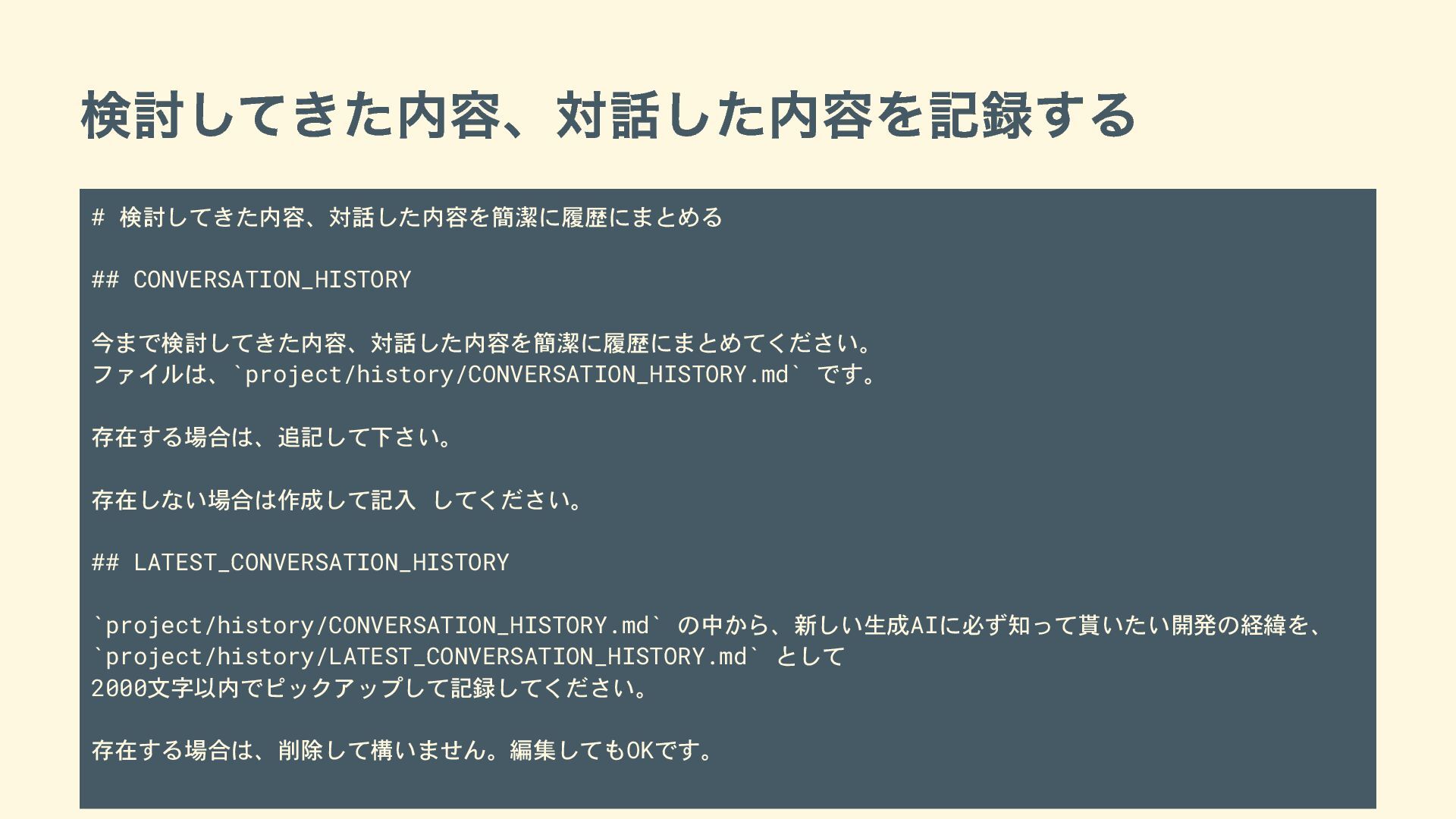 してください。 ## LATEST_CONVERSATION_HISTORY `project/history/CONVERSATION_HISTORY.md` の中から、新しい生成AIに必ず知って貰いたい開発の経緯を、 `project/history/LATEST_CONVERSATION_HISTORY.md` として 2000文字以内でピックアップして記録してください。 存在する場合は、削除して構いません。編集してもOKです。
