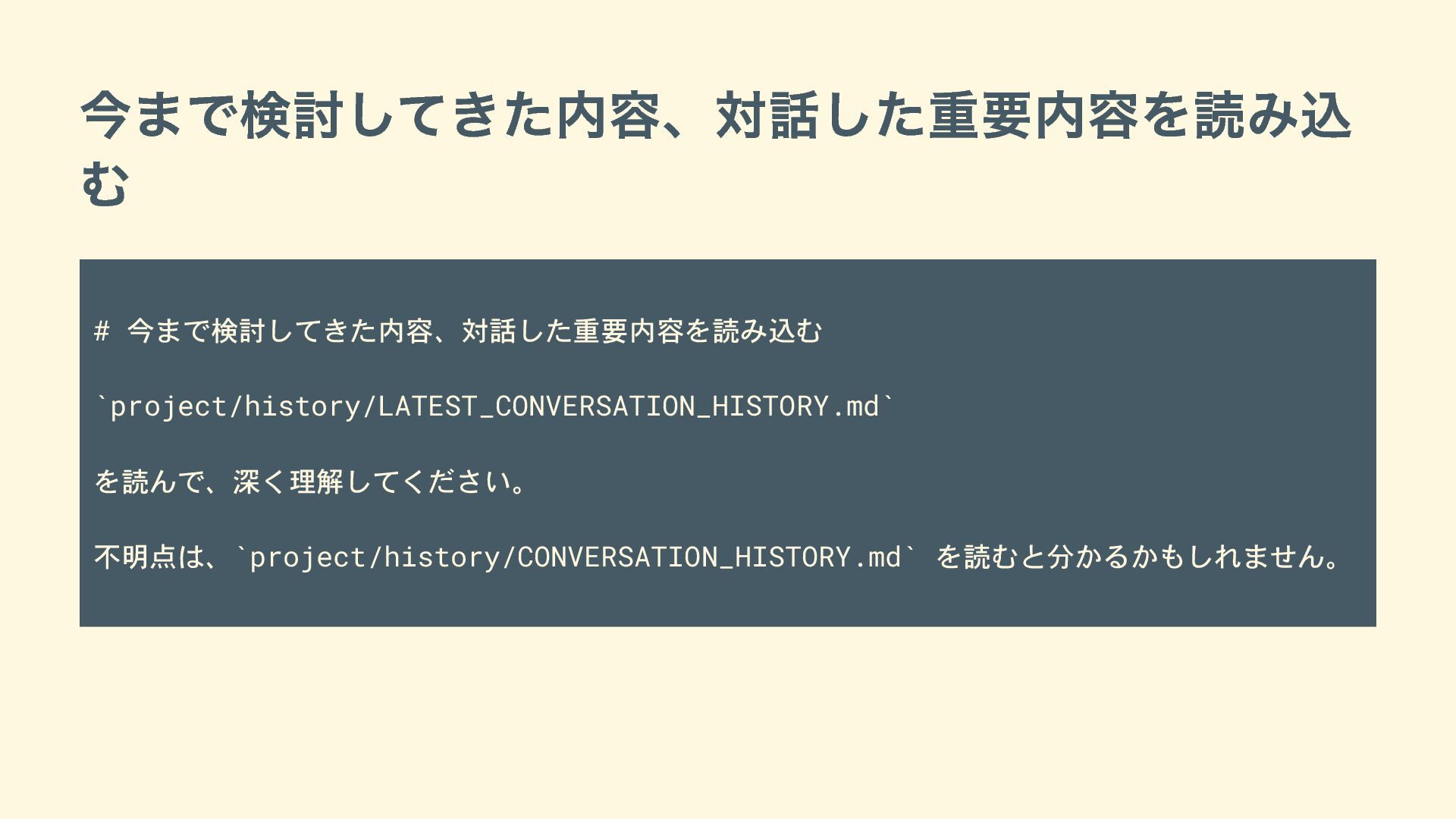 今まで検討してきた内容、対話した重要内容を読み込 む # 今まで検討してきた内容、対話した重要内容を読み込む `project/history/LATEST_CONVERSATION_HISTORY.md` を読んで、深く理解してください。 不明点は、`project/history/CONVERSATION_HISTORY.md` を読むと分かるかもしれません。