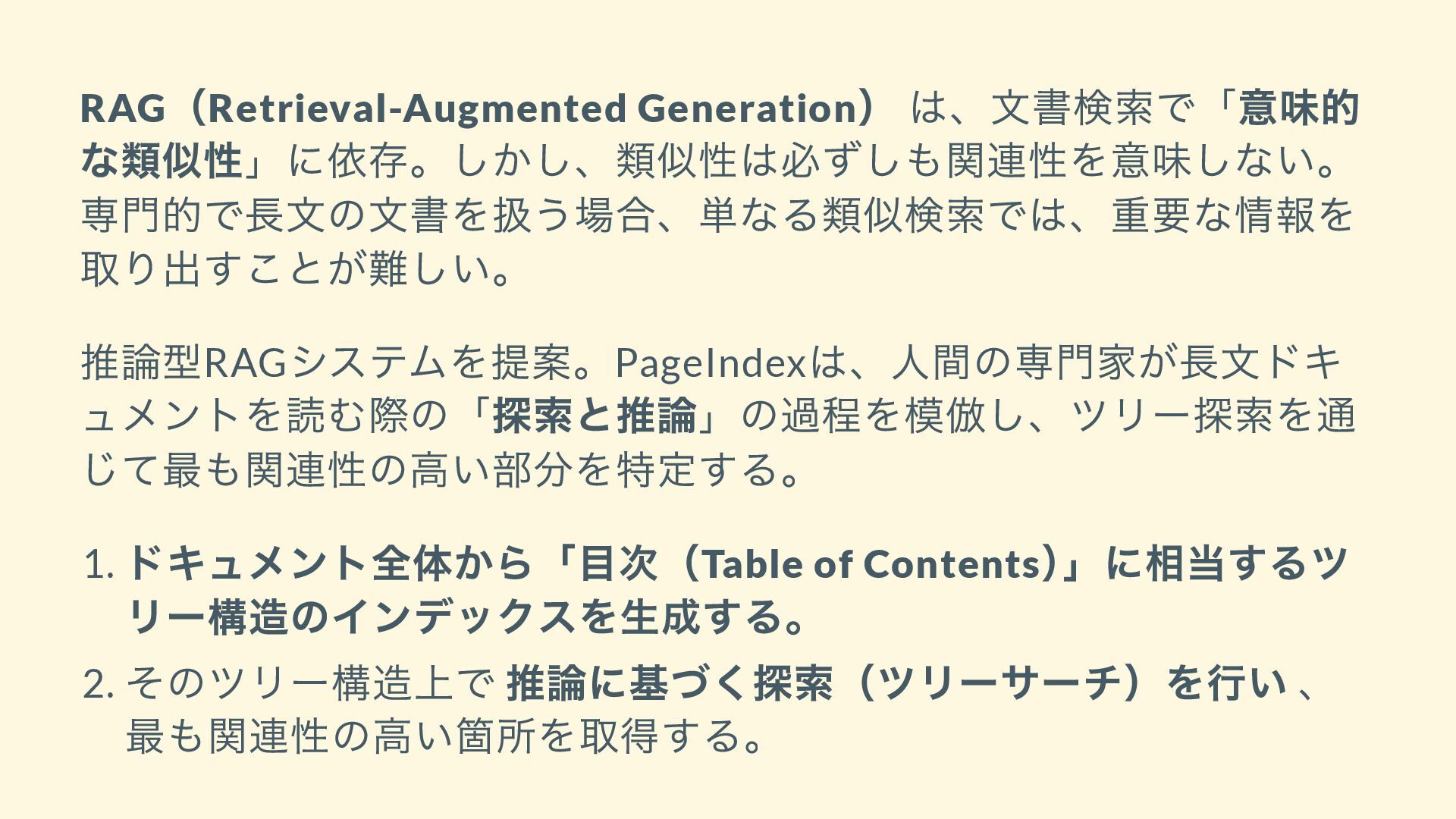RAG (Retrieval-Augmented Generation ) は、文書検索で「意味的 な類似性」に依存。しかし、類似性は必ずしも関連性を意味しない。 専門的で長文の文書を扱う場合、単なる類似検索では、重要な情報を 取り出すことが難しい。 推論型RAG システムを提案。PageIndex