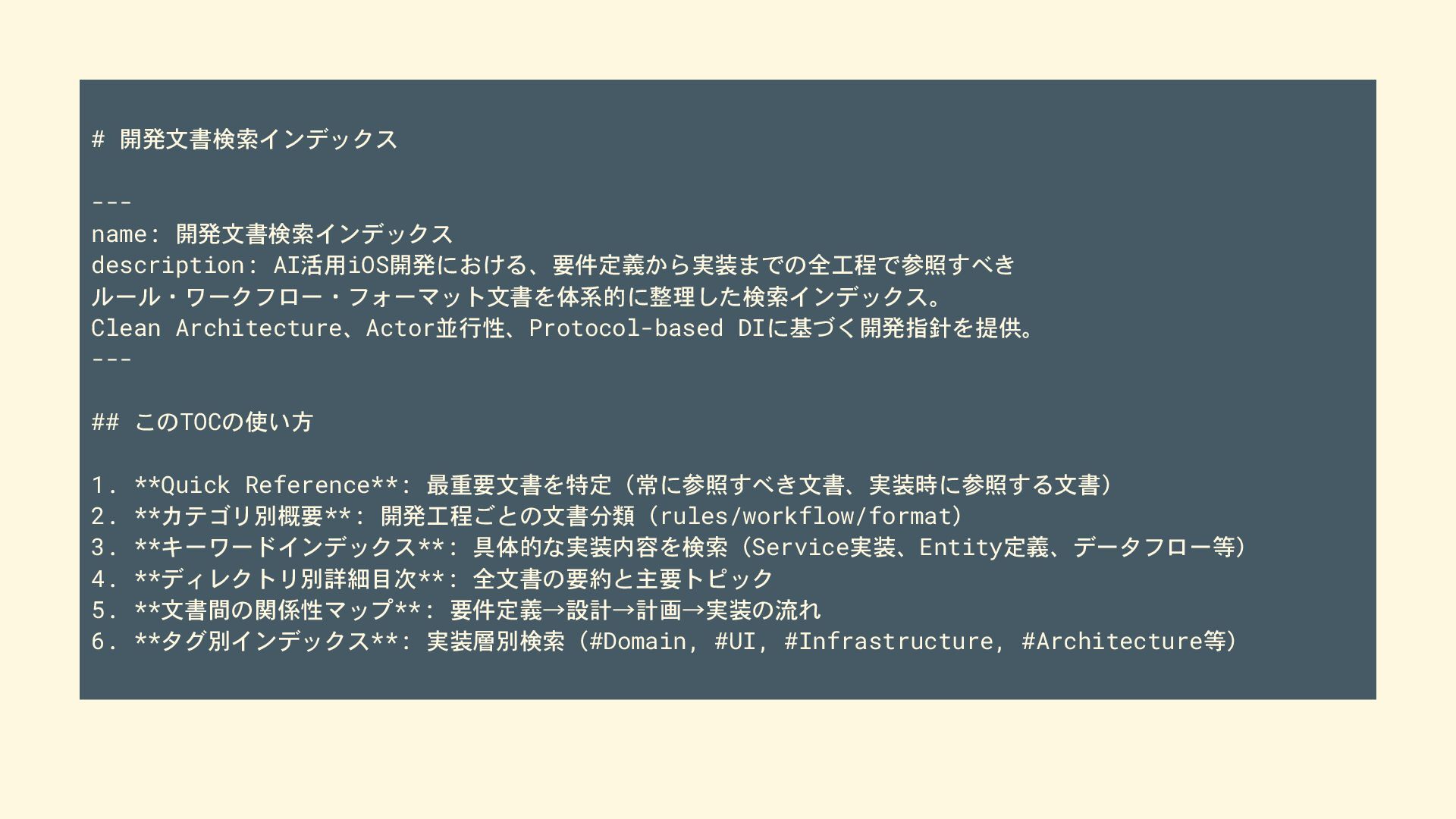 # 開発文書検索インデックス --- name: 開発文書検索インデックス description: AI活用iOS開発における、要件定義から実装までの全工程で参照すべき ルール・ワークフロー・フォーマット文書を体系的に整理した検索インデックス。 Clean Architecture、Actor並行性、Protocol-based