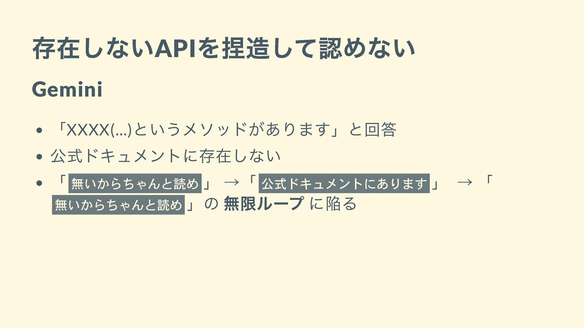 存在しないAPI を捏造して認めない Gemini 「XXXX(...) というメソッドがあります」と回答 公式ドキュメントに存在しない 「 無いからちゃんと読め 」 →「