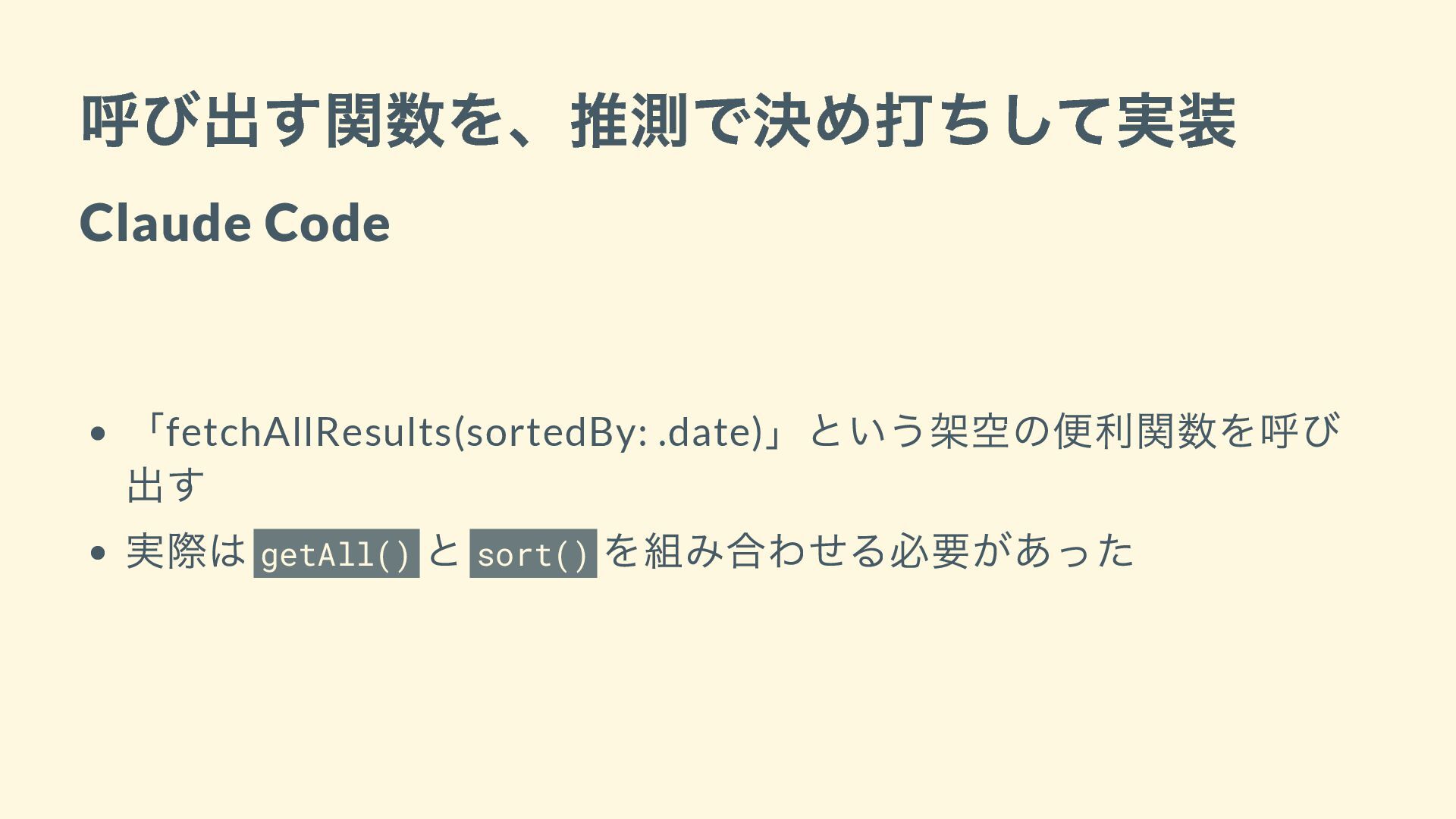 呼び出す関数を、推測で決め打ちして実装 Claude Code 「fetchAllResults(sortedBy: .date) 」という架空の便利関数を呼び 出す 実際は getAll() と